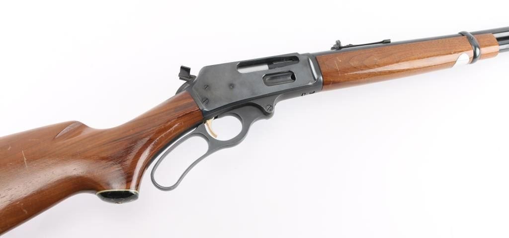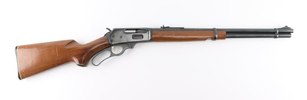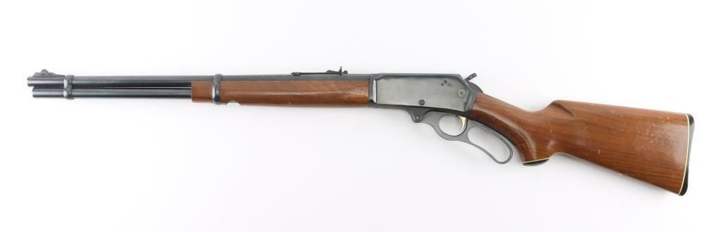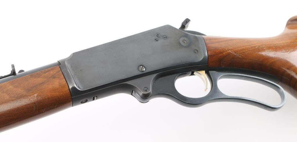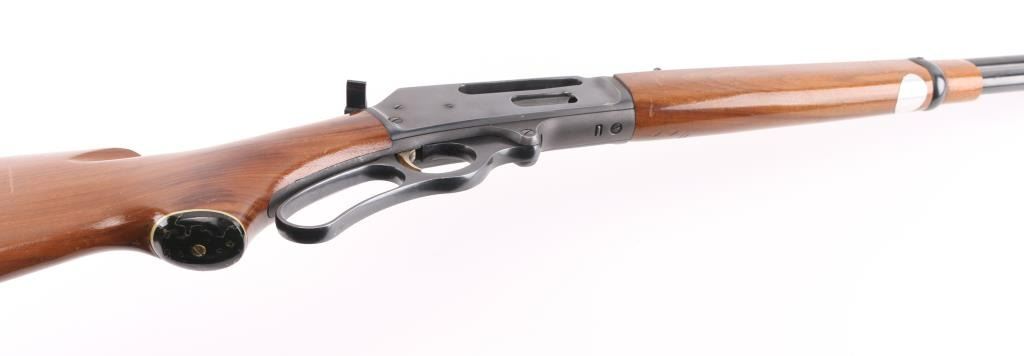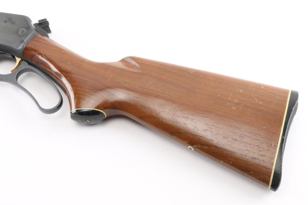 Lever action rifle manufactured circa 1973. Features 20" barrel, ramped blade front sight, buckhorn rear sight, full length tube magazine under barrel, black plastic grip cap and buttplate with white line spacers, smooth faced gold accent trigger, serrated hammer spur with added side extension, curved finger lever. Bore is very good condition. Retains 90% blued finish, with scratches and scrapes. Smooth walnut stock & forend are very good condition with scratches and small dents. Condition is NRA Very Good++ *** C&R Firearm ***