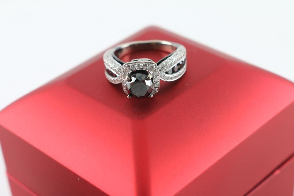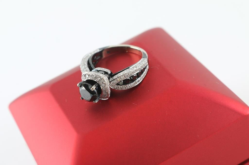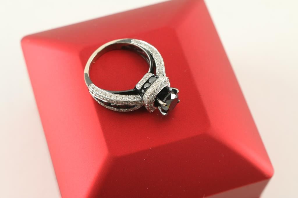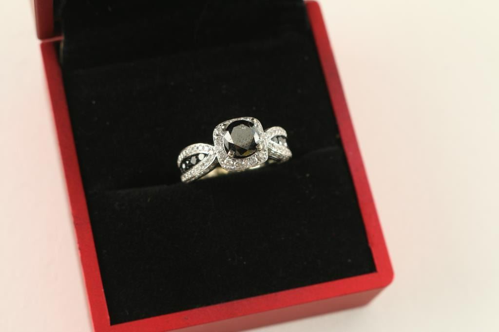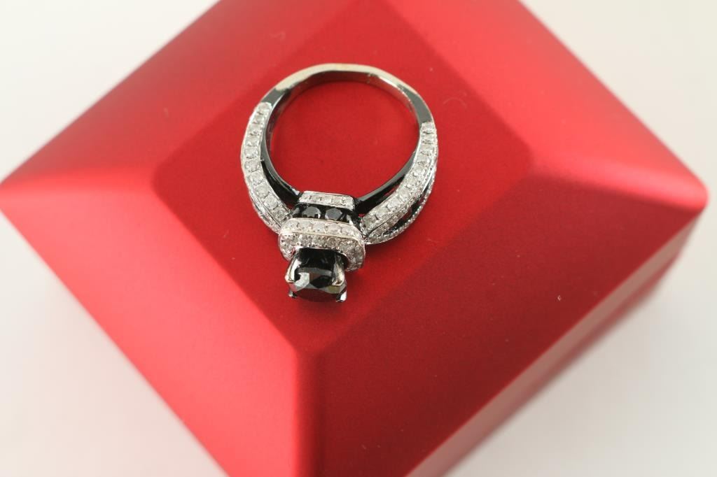 featuring an approx. 1.00 carat natural Black Diamond center Diamond accented with 155 micro set White Diamonds with a combined Diamond weight of approx. 2.5-3.00 carats set in highly detailed 10 karat white gold.