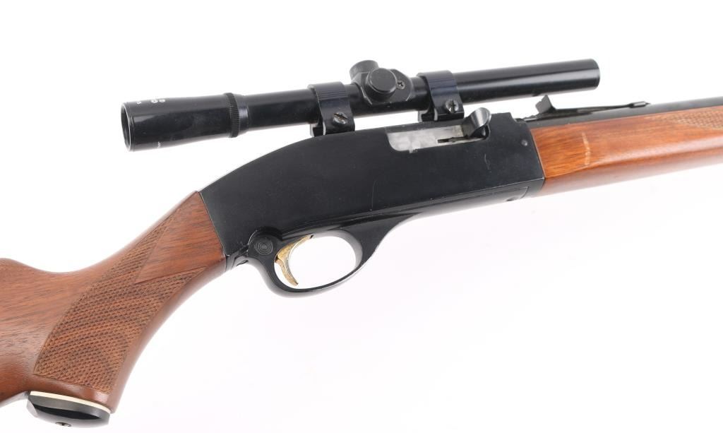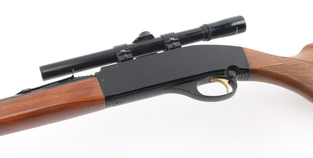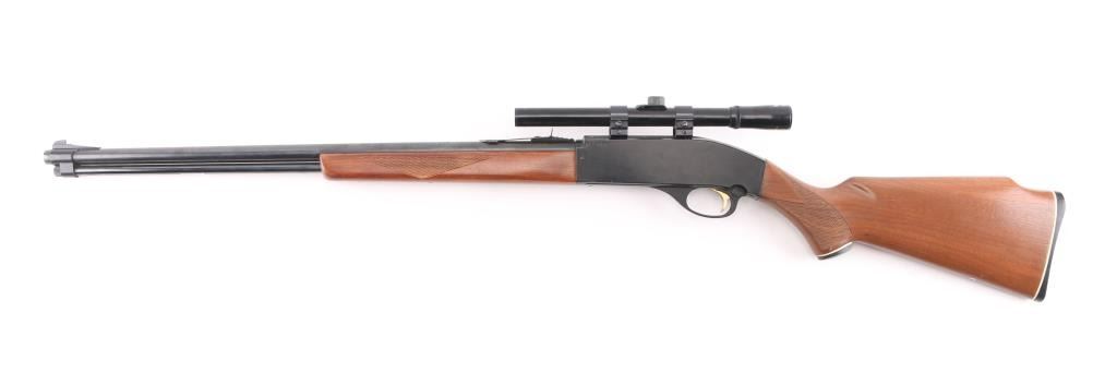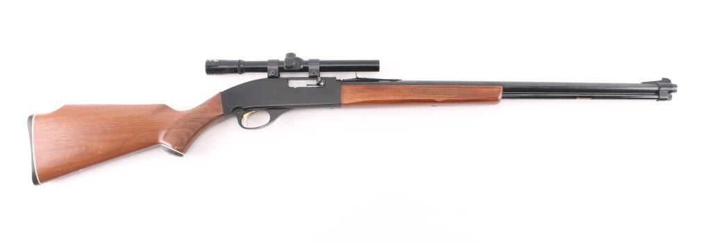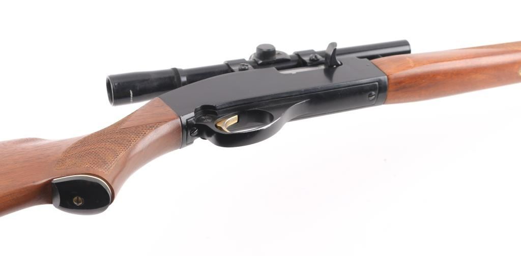 Semiautomatic rimfire rifle for 22 long rifle only. Features blued finish, wood stock with impressed grasping grooves and decorations, black plastic buttplate, and grip cap with white spacers. 22" barrel, full length magazine tube under barrel, blade front & sporting rear sights, grooved receiver, manual bolt hold open, push button safety. Bore is very good/bright. Blued barrel, and matte receiver are very good with edge wear/scratches. Mounts a Tasco 4x15 scope with clear optics. Wood is very good with handliong marks, scratches. NRA Condition-Near Excellent Modern firearm.