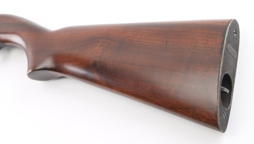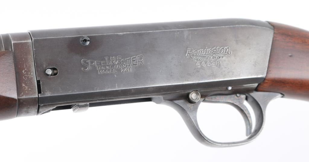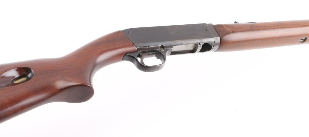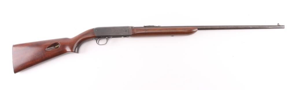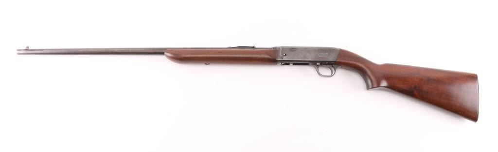 'The Speedmaster' Vintage tube-fed semi automatic sporting rifle chambered in .22 Long Rifle, circa 1938. Barrel marked "22 LONG RIFLE ONLY - SMOKELESS - GREASED". Blued finish, 24" take-down barrel, dovetailed blade front sight, adjustable rear sporting sight, smooth case hardened trigger, push button safety, smooth walnut beavertail forend and pistol grip shoulder stock with loading port & knurled metal buttplate. Bore is very good condition. Retains 80% coverage of fading finish, thinning and turning brown, approx 25% darker blued color, with edge losses, areas of light patina Barrel numbered "44428". Wood is very good. refinished, good fit to metal,slight loss at toe, small scratches & dents throughout. Condition is NRA Very Good+ (stock refinished) *** C&R Firearm ***