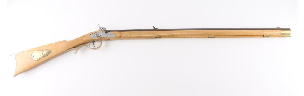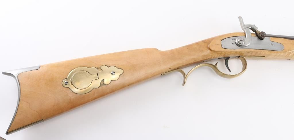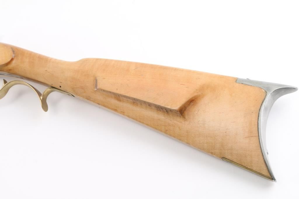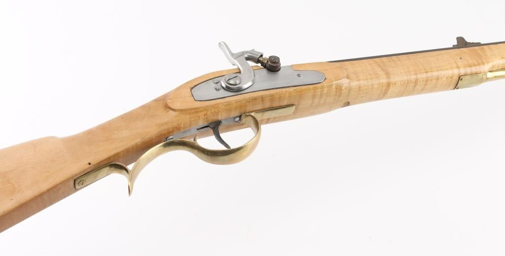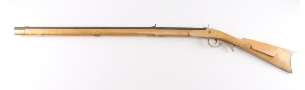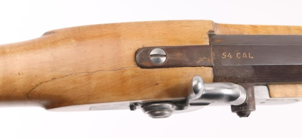 Appears to have been made from a kit or parts. Unmarked except for '54 Cal' on the barrel. 34' plum colored octagonal barrel with fixed sights, nice blond wood stock with brass furniture, left cheek piece, and patch box on right stock. Wood/brass ramrod, steel crescent buttplate, hammer, and lock plate. Two cock action is crisp/tight. Rifled bore is very good. Appears un-fired. Very good condition. Antique Firterm.
