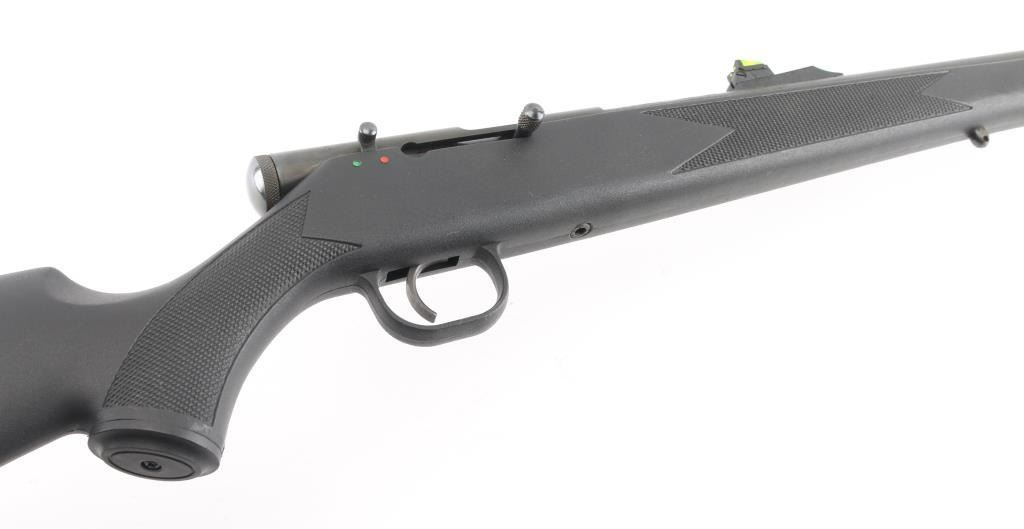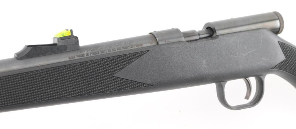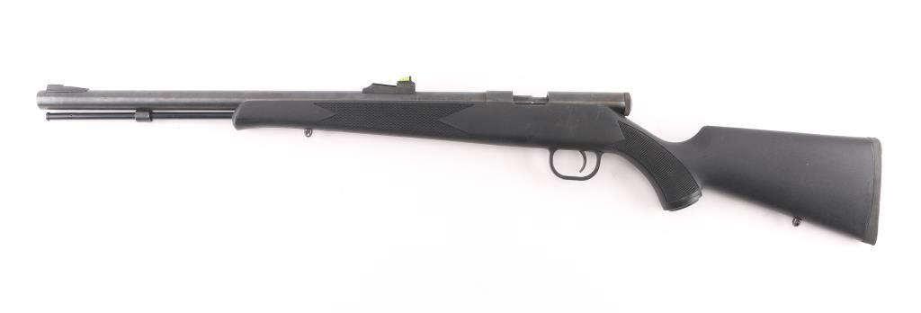 Sn: 14-13-026876-01 Made in Spain. Features blued barrel, black polymer stock with molded checkering panels, rubber butt pad, ram rod under barrel, manual safety, sling studs. Front sight ramp is missing the blade. adjustable rear sight has fiber optic inserts. Bore is pristine, appears unfired. Overall condition is close to excellent with some dark brown rust at rear of barrel just forward of receiver, and a few other places along stock line. Some scuffs to barrel. Condition is NRA Good++ (missing front sight blade) *** 'Antique' Firearm ***