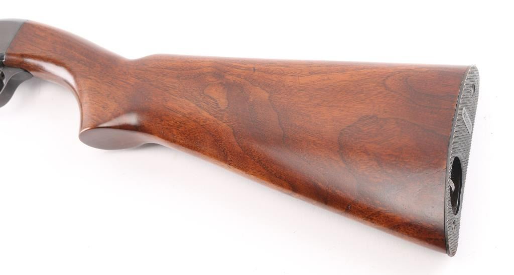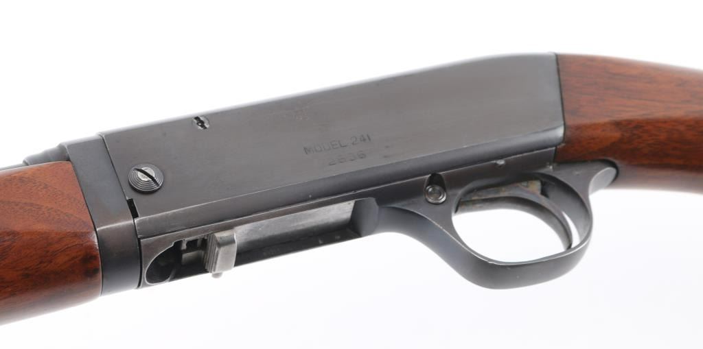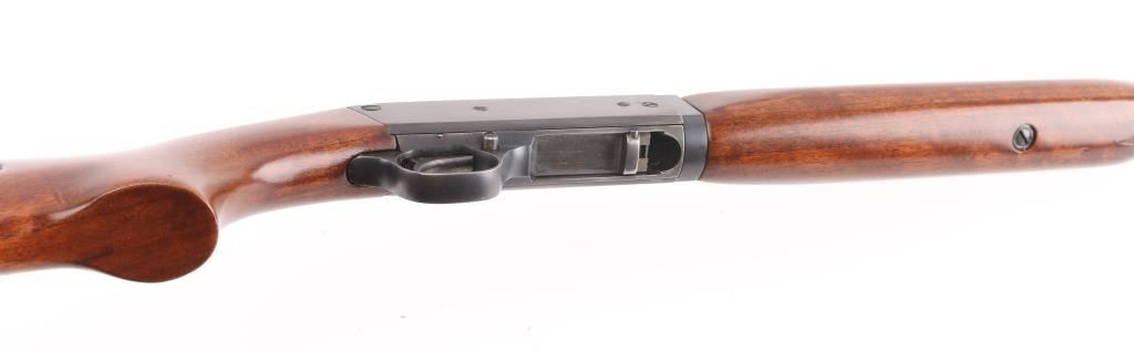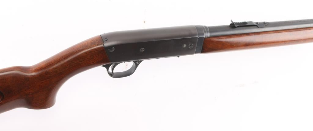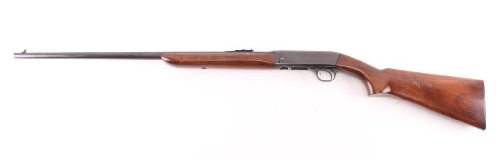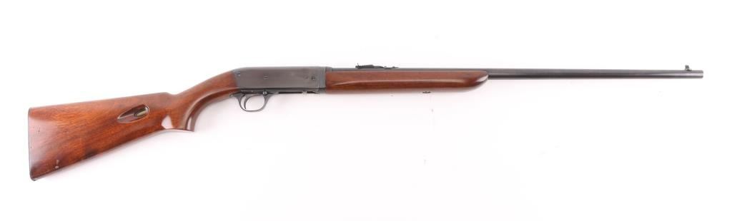 Vintage tube-fed semi automatic sporting rifle chambered in .22 Long Rifle, circa 1935. First year of production, no 'The Speedmaster' roll stamp. Barrel marked "22 LONG RIFLE ONLY - SMOKELESS - GREASED". Blued finish, 24" take-down barrel, dovetailed blade front sight, adjustable rear sporting sight, smooth case hardened trigger, push button safety, smooth walnut beavertail forend and pistol grip shoulder stock with loading port & knurled metal buttplate. Bore is very good condition. Refinished, showing 90% dark bluing, with edge losses, handling marks, small dents, some blemishes retained under refinish. Wood is very good condition, nice figure, minor erosion at toe, scratches and slight dents in several places. Barrel numbered "2636". Condition is NRA Very Good++ (refinished) *** C&R Firearm ***