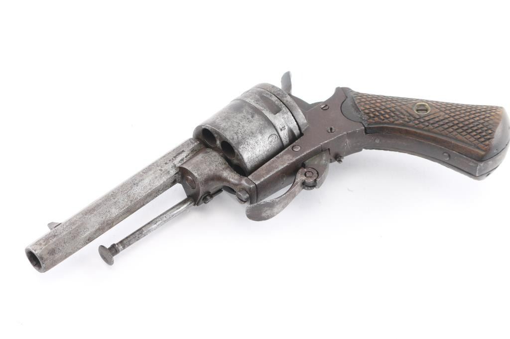 Belgian proofed pocket revolver with folding trigger, maker marked on left barrel, but can't make it out. 3.5' barrel, checkered wood grips Caliber is a little smaller then a .32.Metal has turned a gray patina. Fires single-action, trigger does not return, has to pushed forward. Antique Firearm.