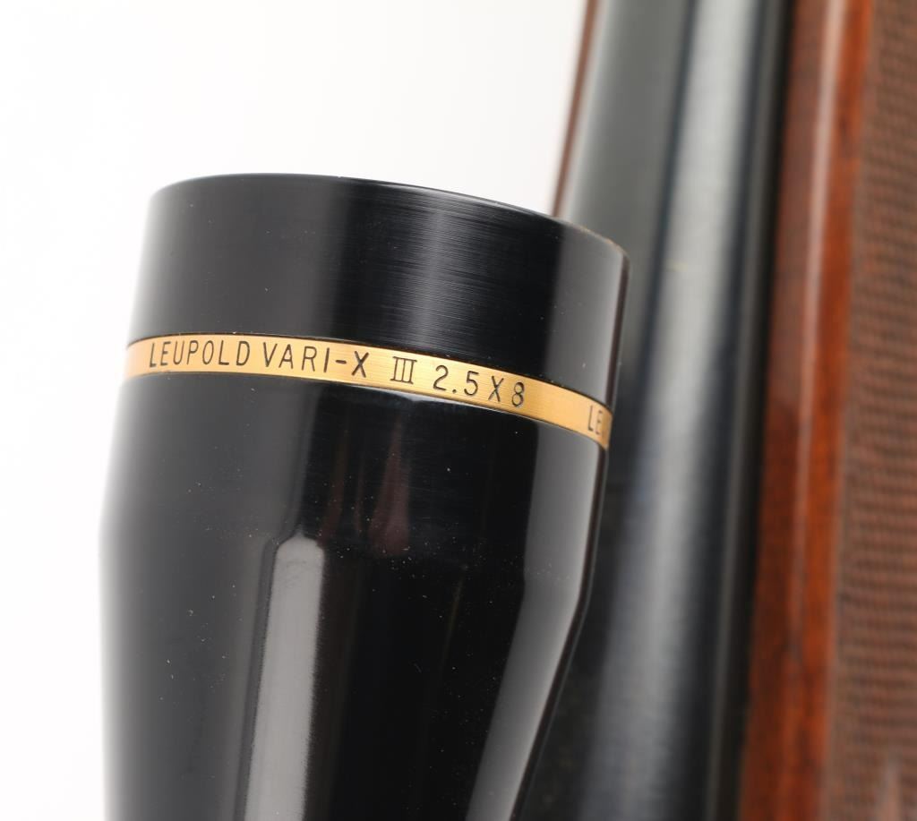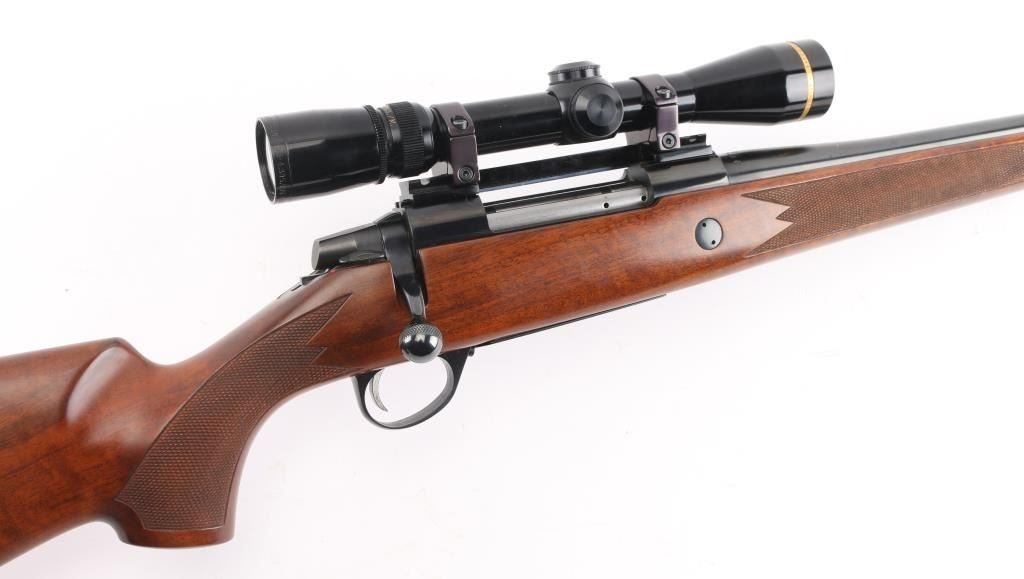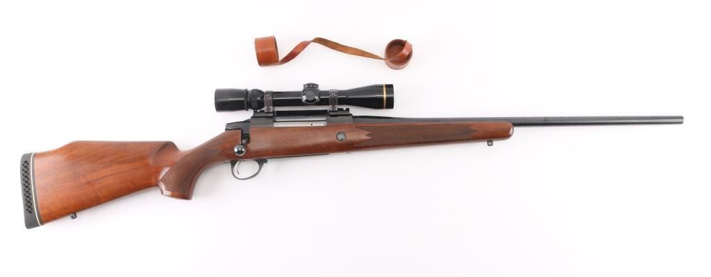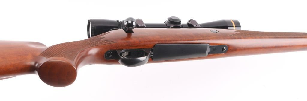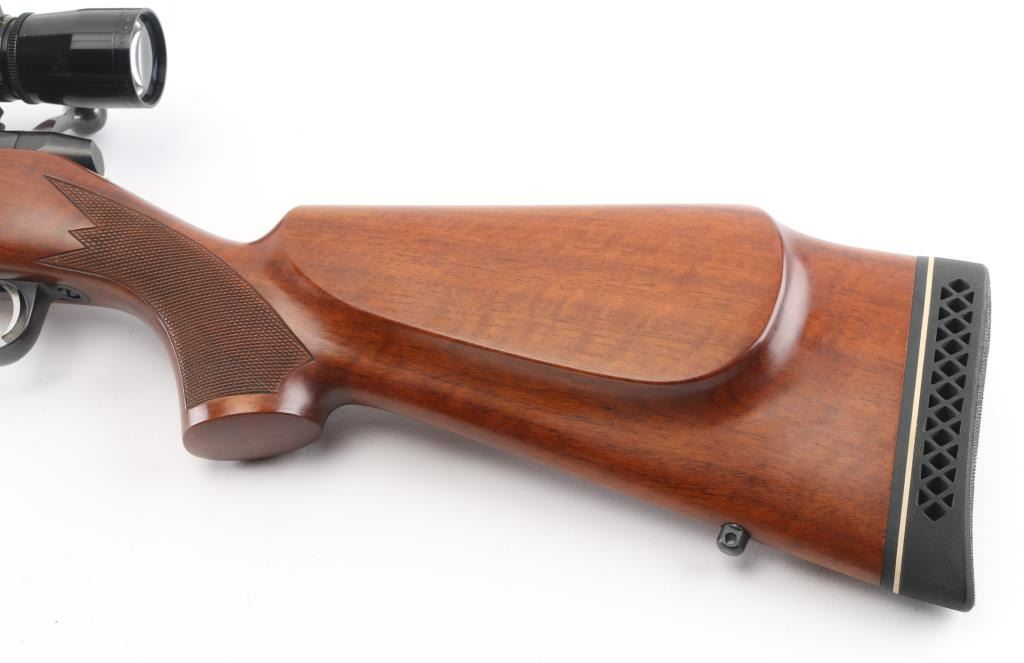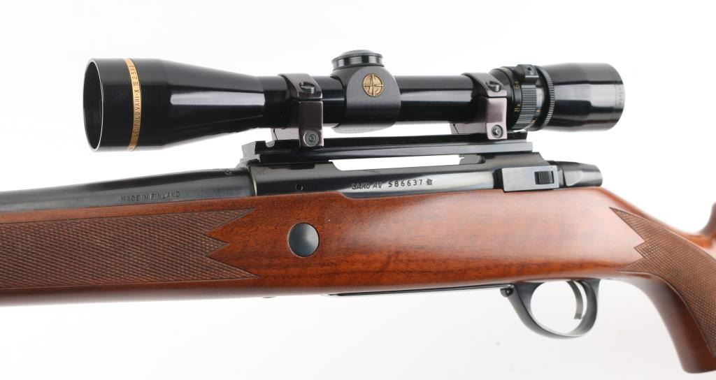 Finnish bolt action rifle, imported by Stoeger, NJ. Features blued finish, wood Monte Carlo stock with right handed cheek piece, ventilated rubber recoil pad, checkered panels at forend & curved wrist, sling studs, 23" barrel, no sights, hinged floorplate, manual safety, flat top receiver with dovetails. Mounts a very good condition Leupold Vari-X III 2.5-8x scope with fine crosshairs, leather caps. Bore is very good bright condition. Retains 95% dark bluing with few signs of handling. Stock is very good condition with few small dents. Condition is NRA Excellent *** Modern Firearm ***