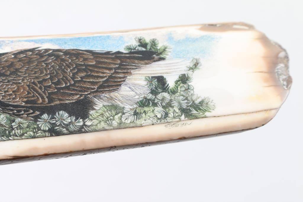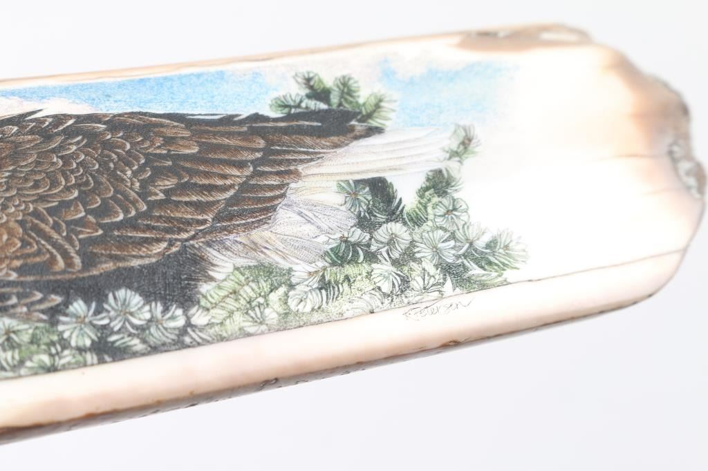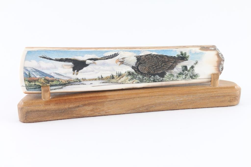 by K. Peterson depicts eagles, signed, measures 7.5"x1.5 includes wooden stand.