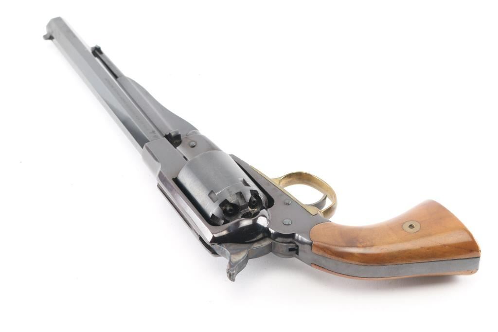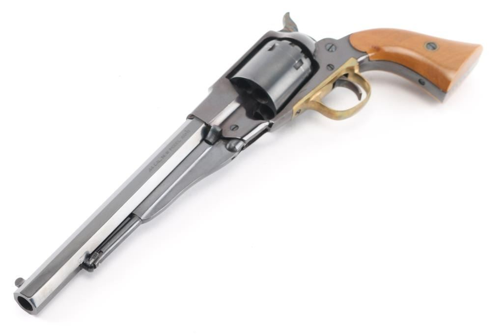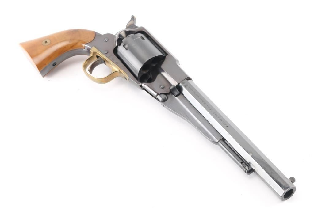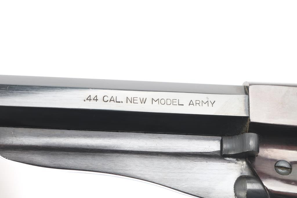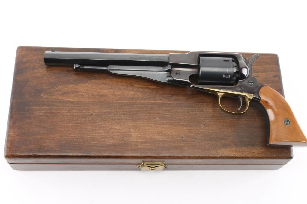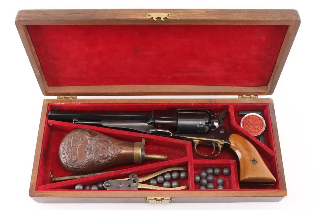 Cased Italian made reproduction of the Remington New Model Army single action percussion revolver chambered for .44 caliber, imported and marketed by Lyman. Features a blued finish, 8" octagonal barrel, blade front sight, 'v' notched rear sight, smooth wide trigger, knurled hammer spur, non-fluted six shot cylinder, loading lever, brass trigger guard, and two-piece varnished walnut grips. Revolver exhibits approximately 99% of it's original blued finish showing very little wear. Action is smooth, the bore is pristine and the wood grips are very good. Comes in a fitted red felt lined wood box with powder flask, bullet mold, caps tin, nipple wrench, cap loader, and ammo. A really nice set. Manufactured 1977 (AB) NRA Condition-Near Excellent. Antique Firearm