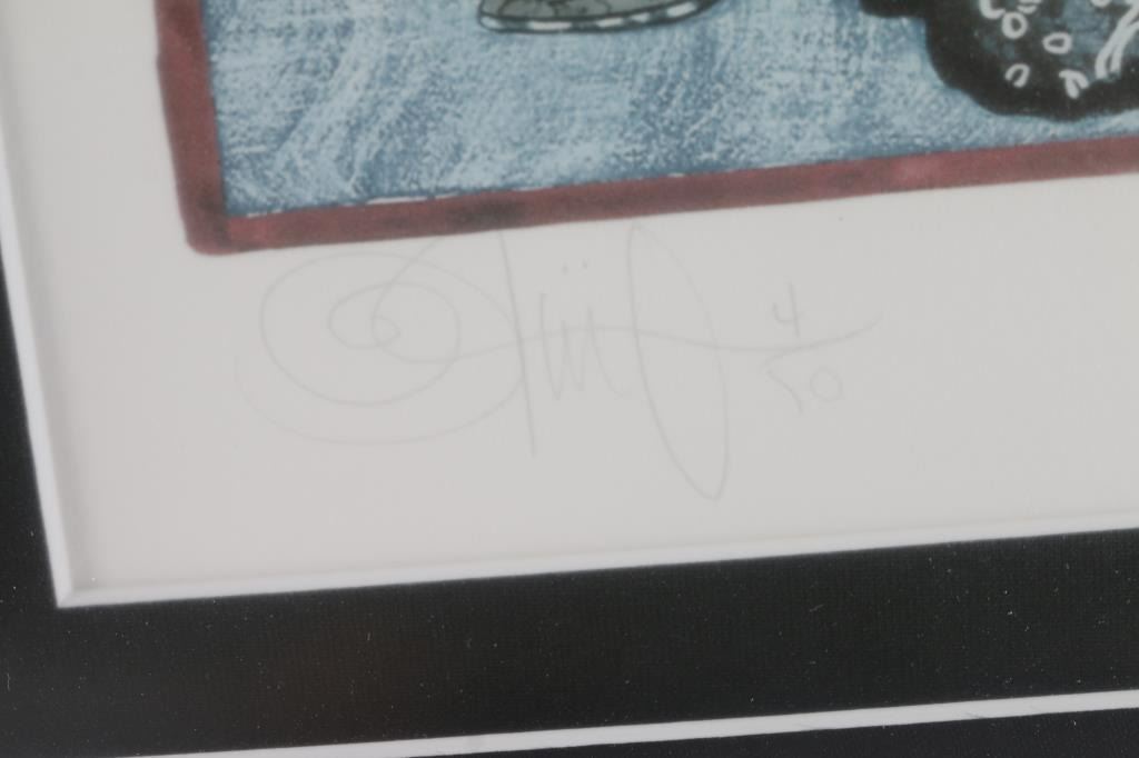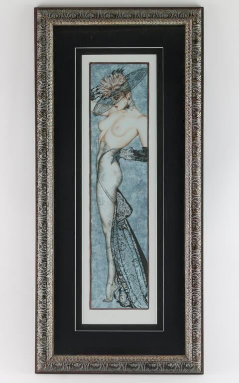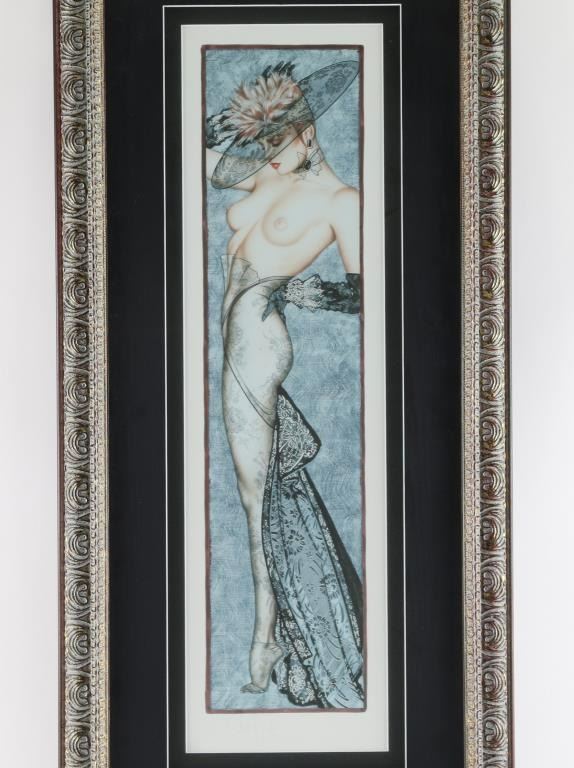 of topless woman hand signed and numbered in pencil. Double matted and framed. Measures 25"x7"/