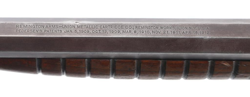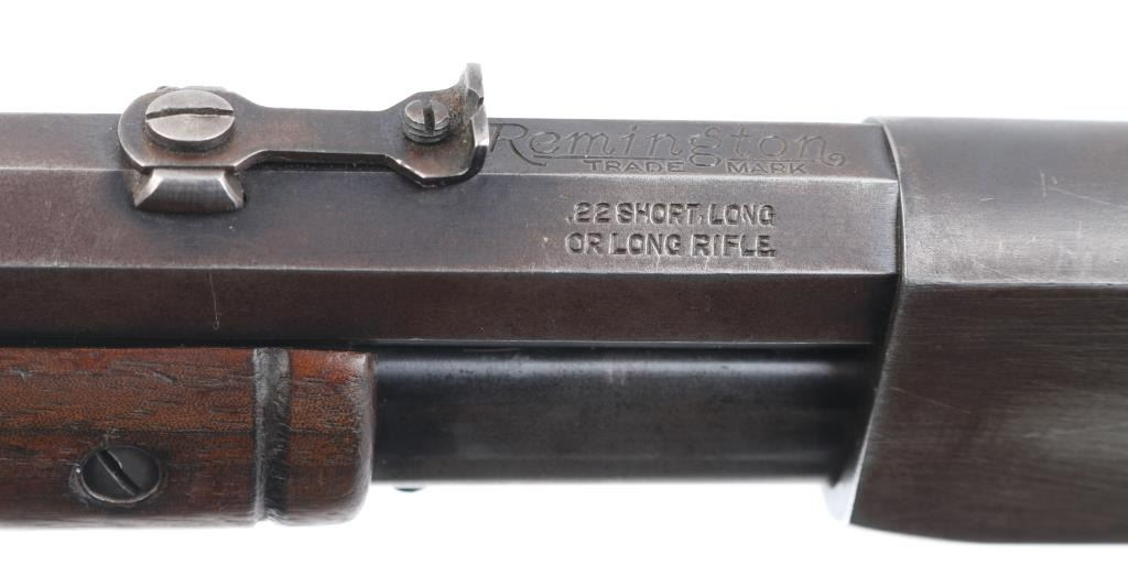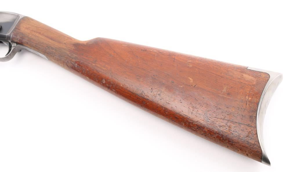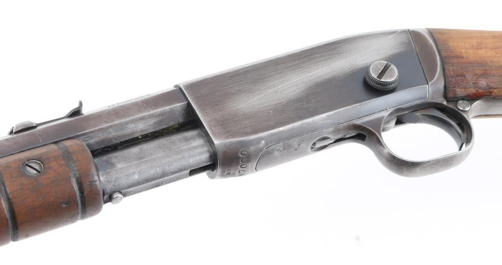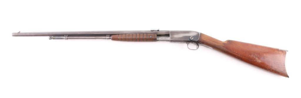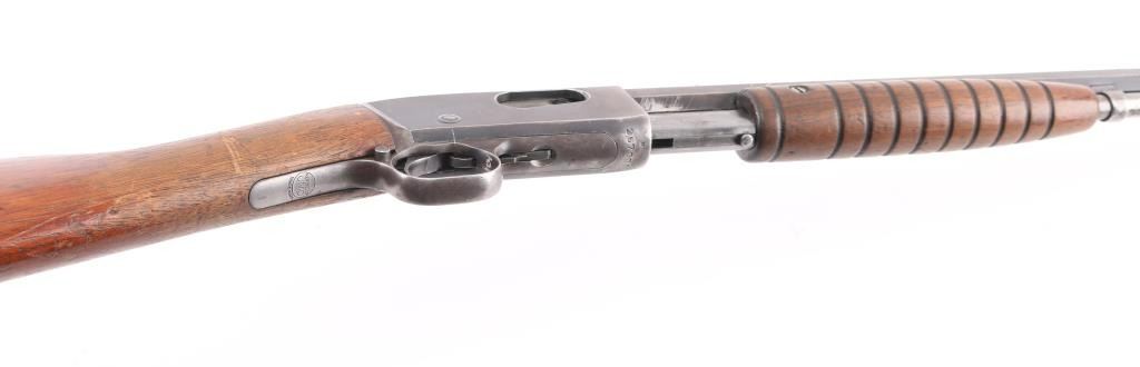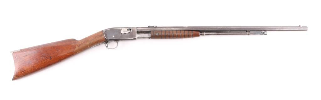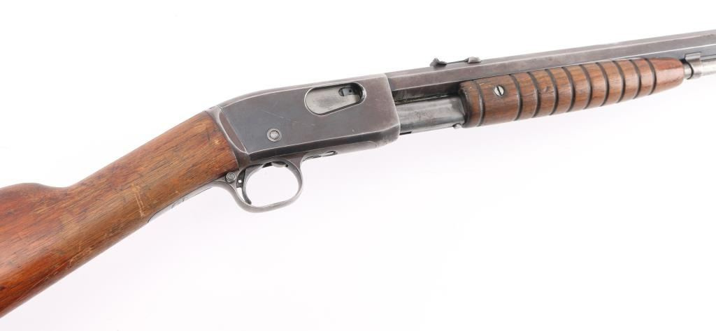 Vintage take down pump action rimfire rifle manufactured circa 1914. Features 24" octagon barrel, 3/4 length tube magazine, dovetailed blade front & adjustable rear sight, pushbutton safety, grooved walnut "corn cob" pump handle, straight wristed smooth walnut butt stock, steel crescent butt plate. Bore is good overall, fairly bright with some frosting and loss to sharpness of rifling, clear ring several inches from muzzle. Retains little original finish, shows majority coverage of faded gray or brown finish, much bare metal. Wood is good condition with finish losses, some roughness at wrist. Action is sound. Front face of barrel marked "JLY" in small letters with electric pencil. Condition is NRA Good *** C&R Firearm ***