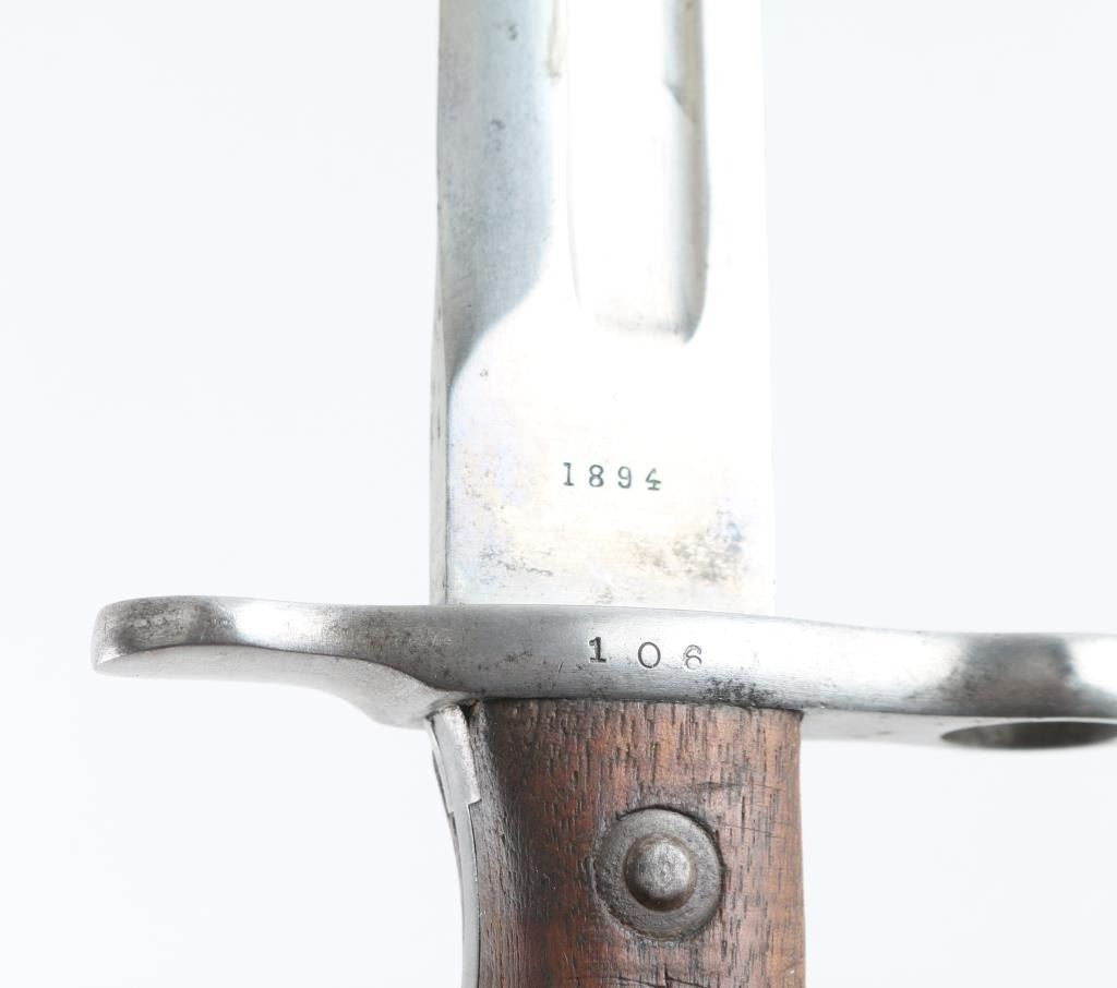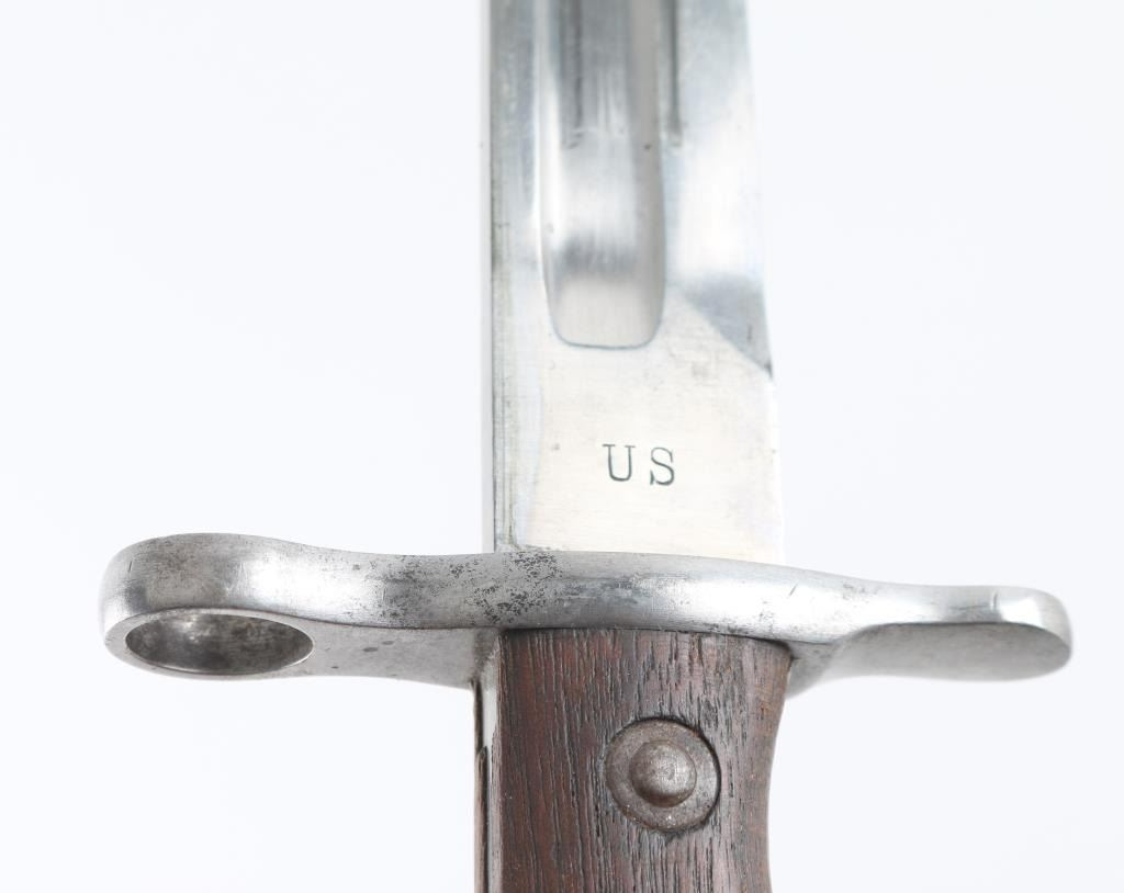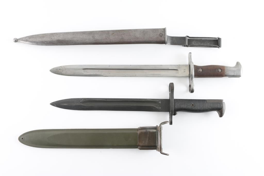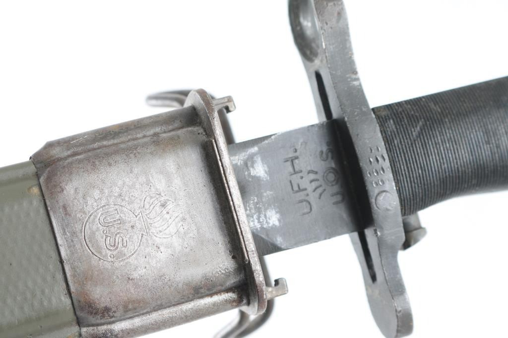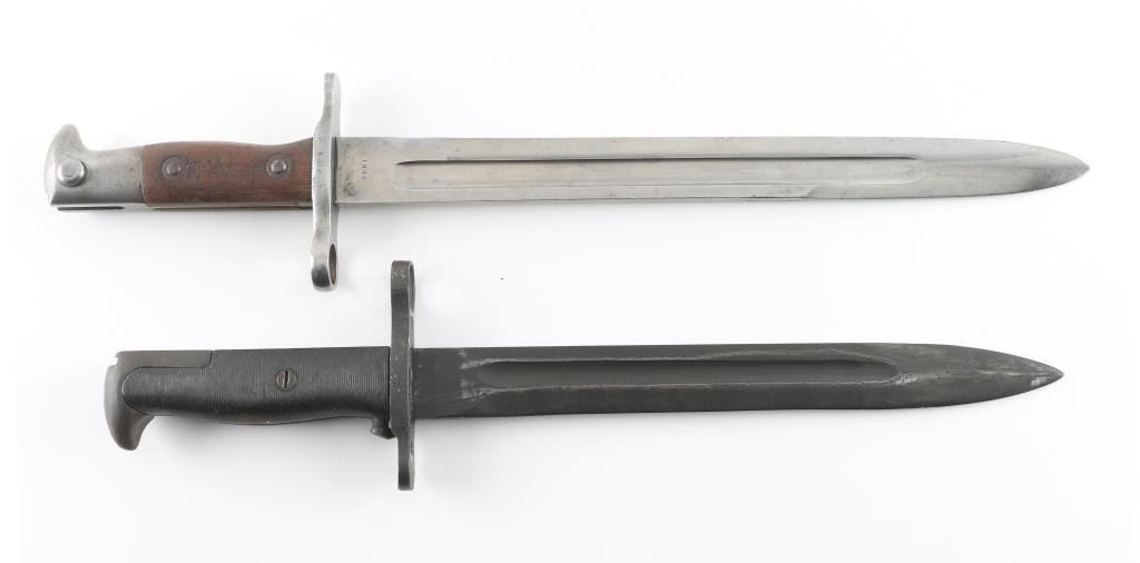 Two Total. 1) U.S, Model 1892 bayonet for the 1896/98 Infantry rifles. Dated 1894, 'U.S.' stamped on ricasso. '106' stamped on crossguard. "B.G.L.' is lightly carved on left grip panel. 2nd pattern scabbard (Model 1899) 11.5' blade. Very good condition. 2) U.S. M1 Garand bayonet , 9.75' blade, ricasso stamped 'U.F.H. U.S.' with flaming bomb. (Union Fork & Hoe) Scabbard fitting marked 'U.S.' in flaming bomb. Very good condition.