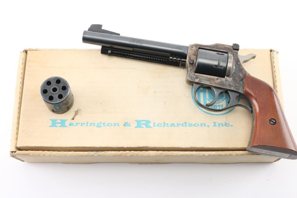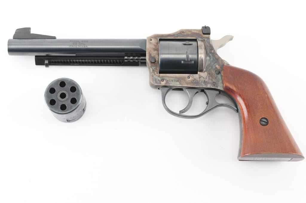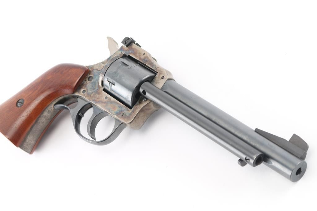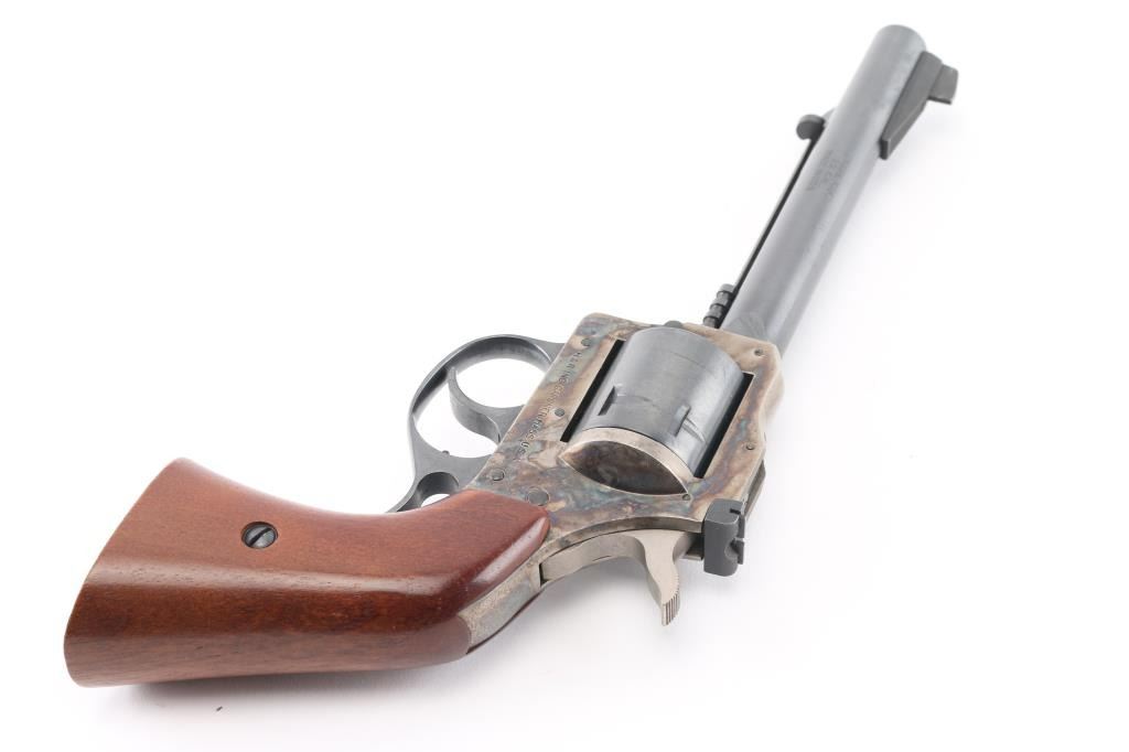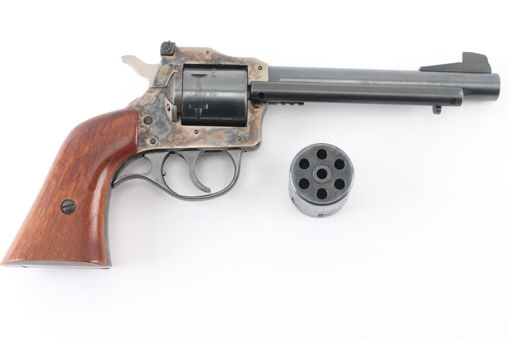 Double action rimfire revolver with cylinders for 22 Long Rifle and 22 WMR (Magnum) cartridges. Features blued finish with case color frame, 5.5" barrel with ejector rod mounted to side, side gate loading, adjustable rear and Partridge front sights, 6 shot unfluted cylinders, smooth wood grip. Revolver is in near pristine condition with few handling marks, in factory box (not original, but proper box). Condition is NRA Excellent *** Modern Firearm ***