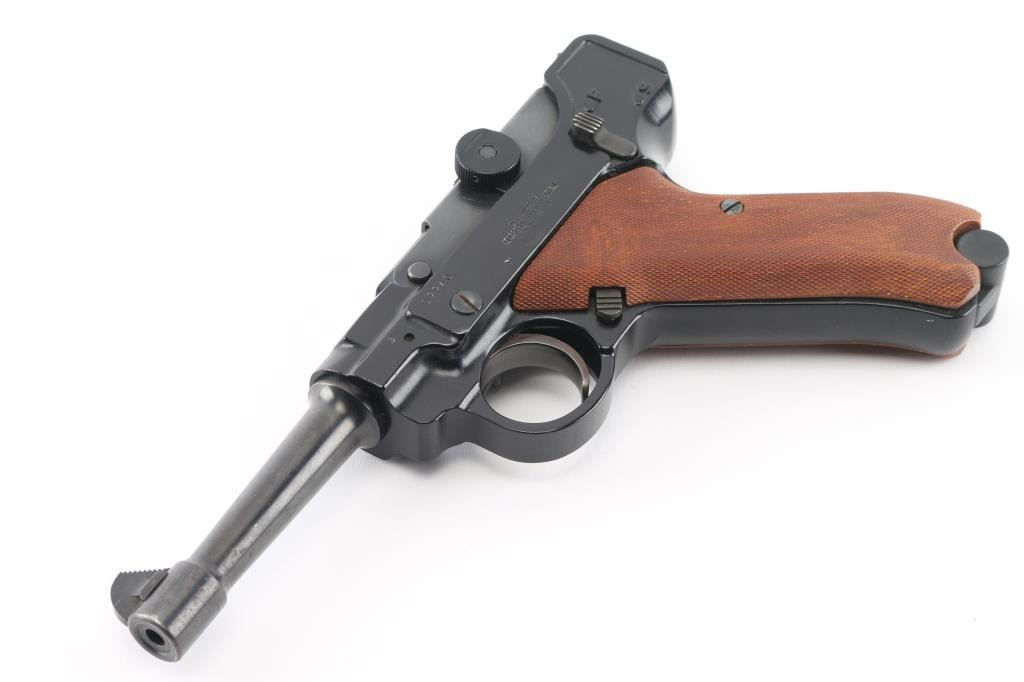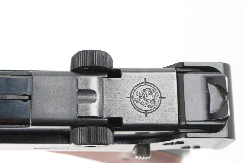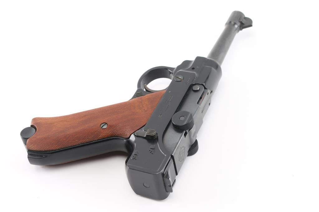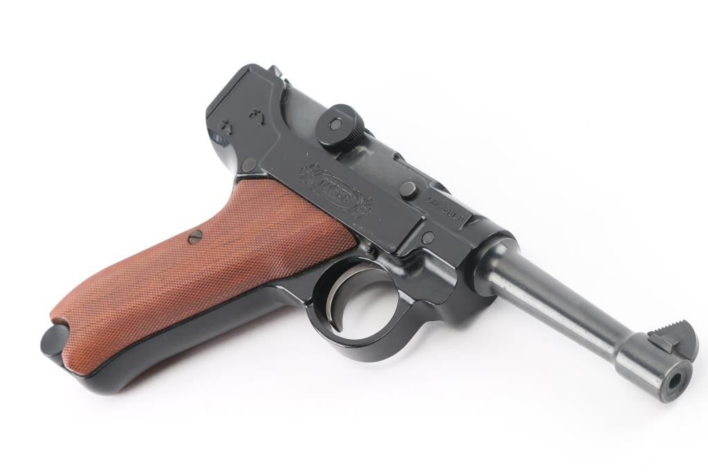 American made semi-automatic rimfire pistol modeled after the iconic DWM Parabellum-Pistole and chambered in .22 Long Rifle. Features a blued 4 1/2" tapered barrel, dovetailed blade front sight, fixed rear sight with square notch, smooth crescent trigger, thumb safety on the left side of the frame, push button magazine release, blue finished alloy frame and two-piece checkered wood grips. Bore is very good condition. Retains 95% finish with light edge wear & handling marks. Grips are excellent. Includes (1) magazine and a fair condition original factory box. Condition is NRA Excellent *** Modern Firearm ***