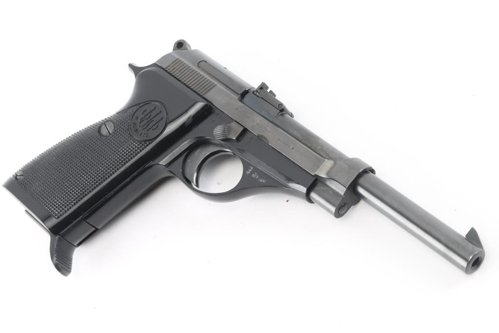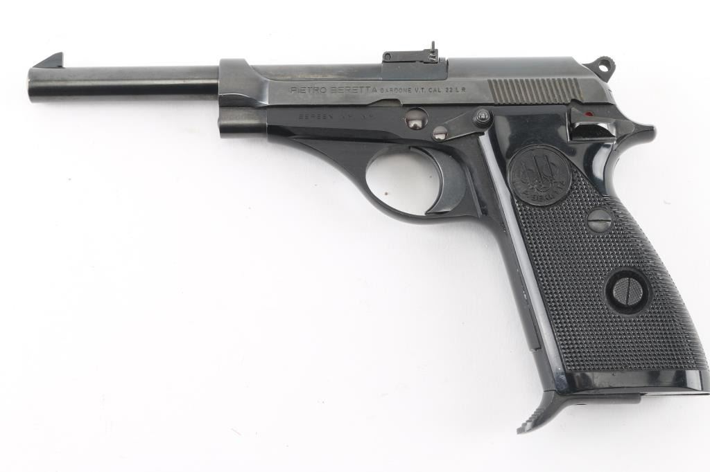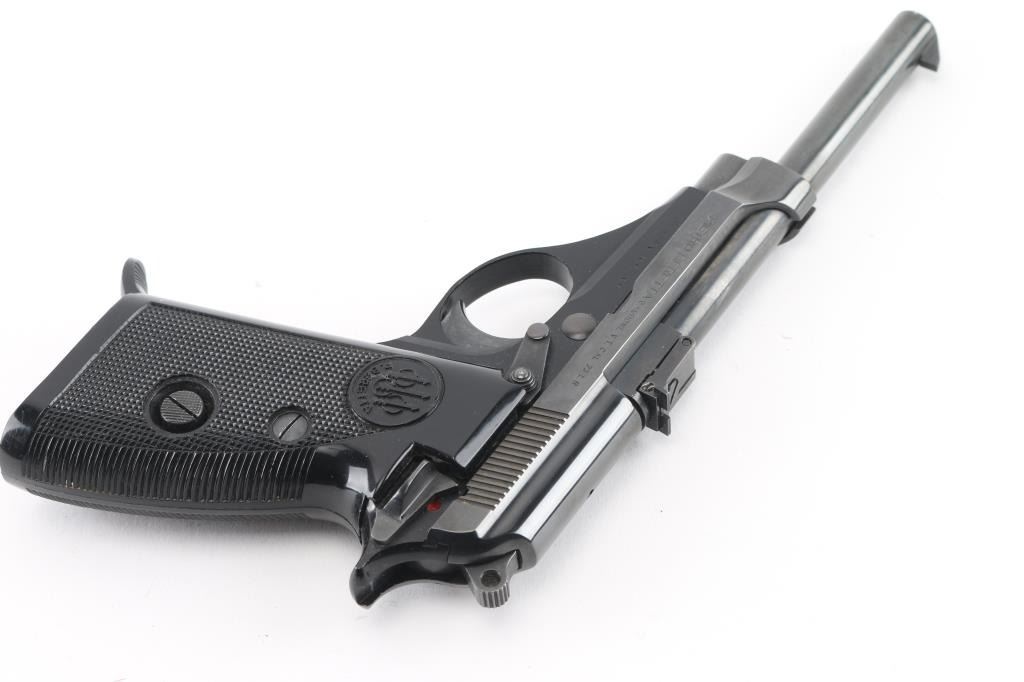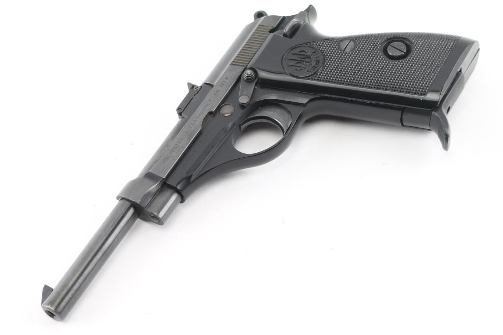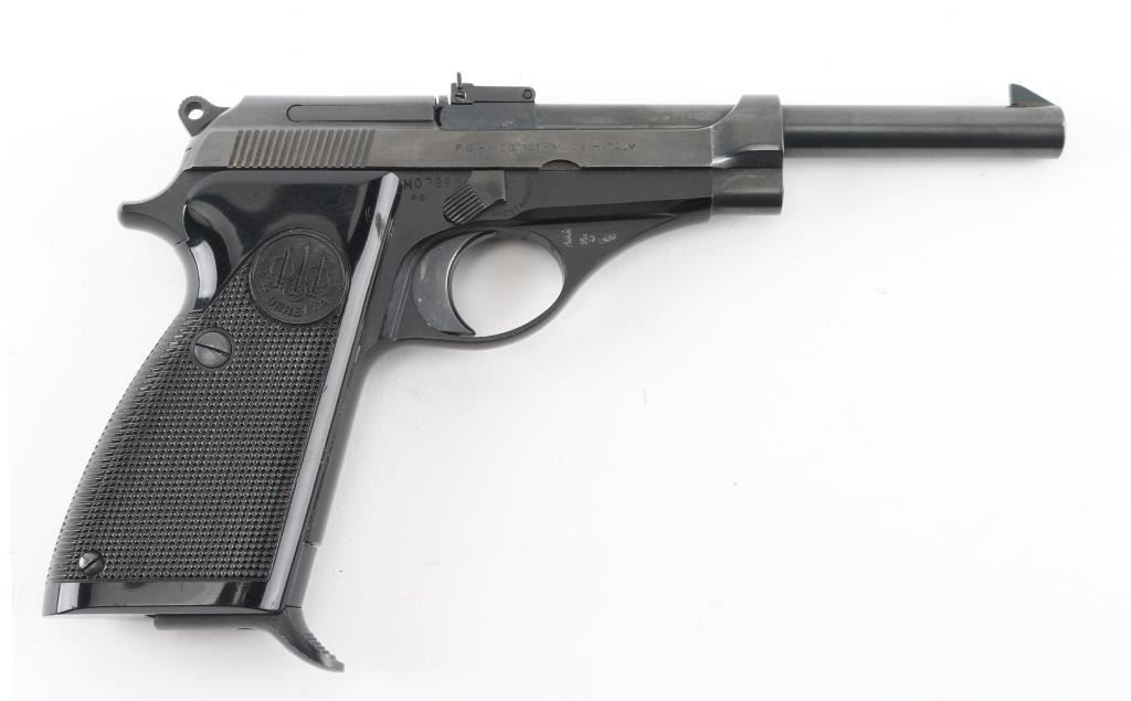 Italian rimfire semiautomatic pistol imported by Berben, NY NY. Proof code date of 1969. Features blued finish, checkered black plastic grips, 5.75" barrel, adjustable sights on barrel, single action trigger, frame mounted manual safety, push button mag catch in middle of grip. Bore is excellent. Bluing is 95% or better with few signs of use. Condition is NRA Excellent *** C&R Firearm ***