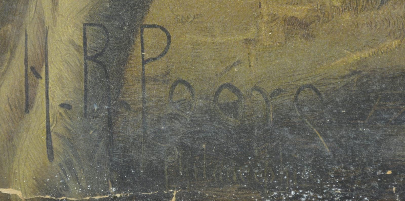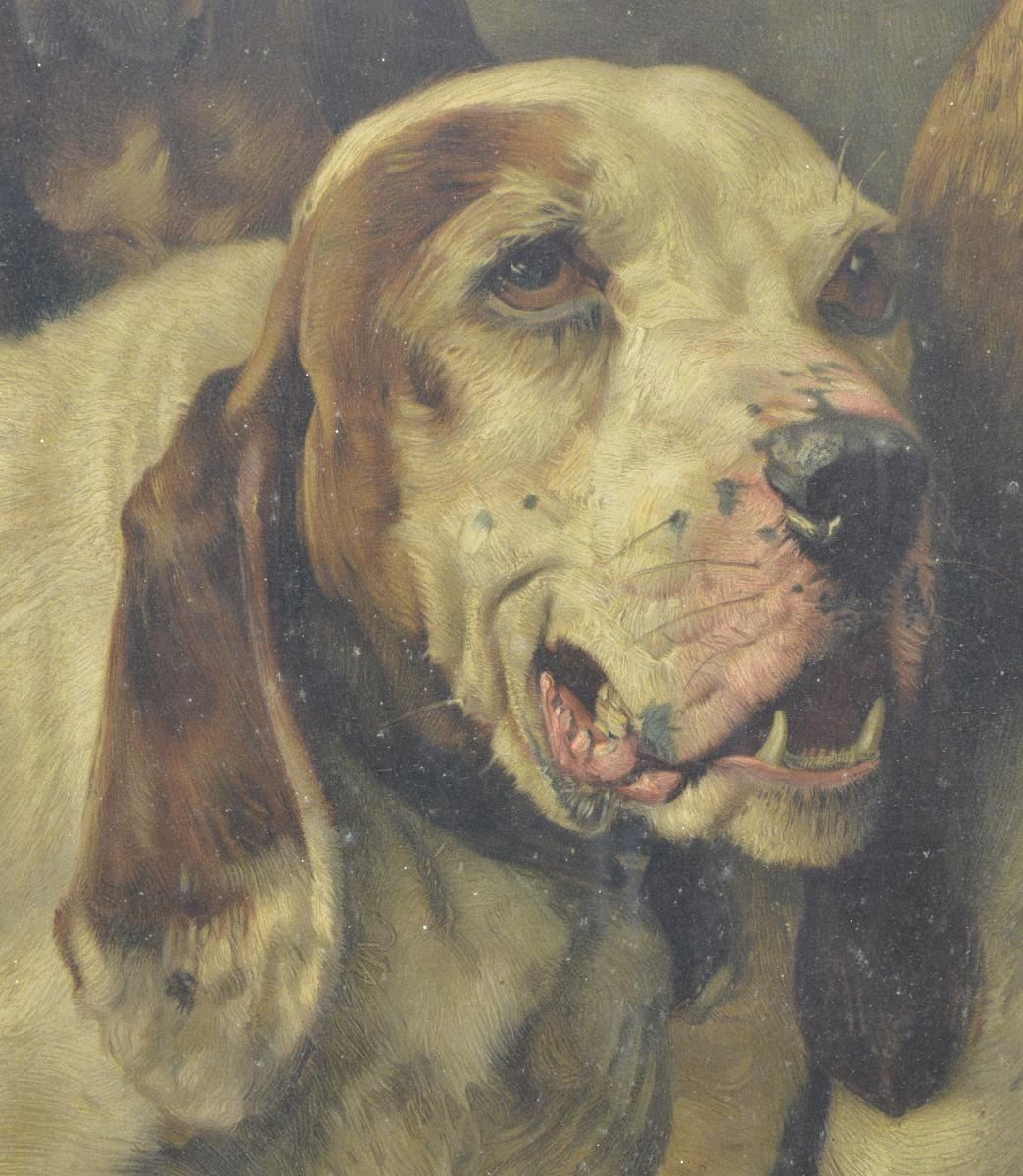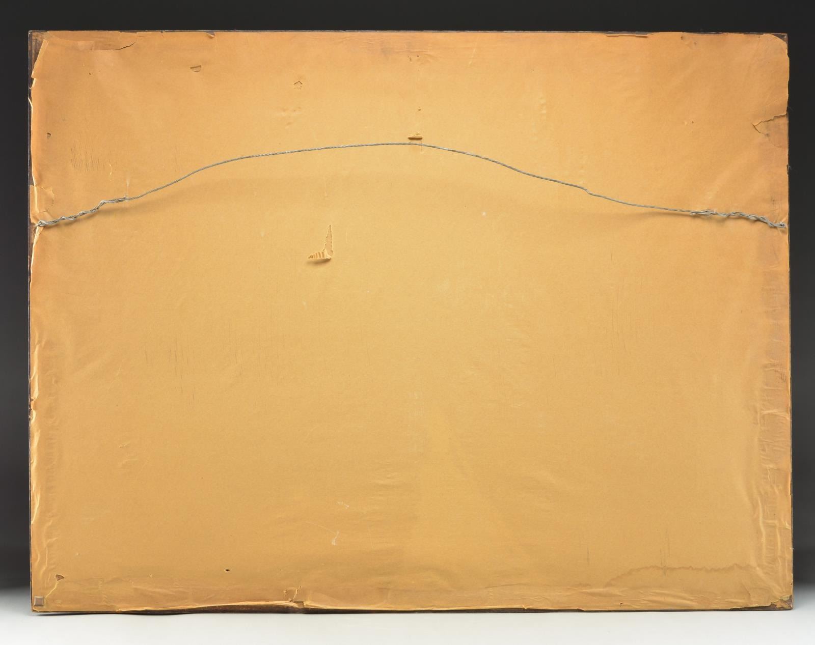 This 35" x 25" print is of a well known painting of four bear hunting dogs by Henry Rankin Poore of Philadelphia (1859-1940). This image was used by the Winchester Repeating Arms company for advertising of their ammunition & arms. This print is held in a 39.5" x 30.5" dark varnished walnut frame w/ print held by cardboard, w/ paper back & hanging wire. CONDITION: While unable to remove print for proper inspection, the print shows tack hole damage in corners along w/ sm. tears, cracking of finish, white spots along bottom edge, crease & scuffs. Frame appears in good condition w/ light scuffs & scratches. Paper shows water stains along edges, sm. holes & large tears. (02-19731/MD). $3,000-5,000.