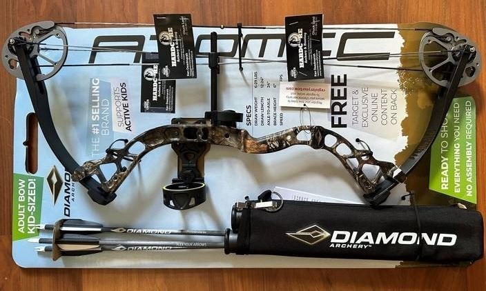 Courtesy of Hardcore Archery & Hunting, this kid-sized Diamond Atomic kids compound bow "fits kids of all ages and has a wide variety of draw weight and draw length options."