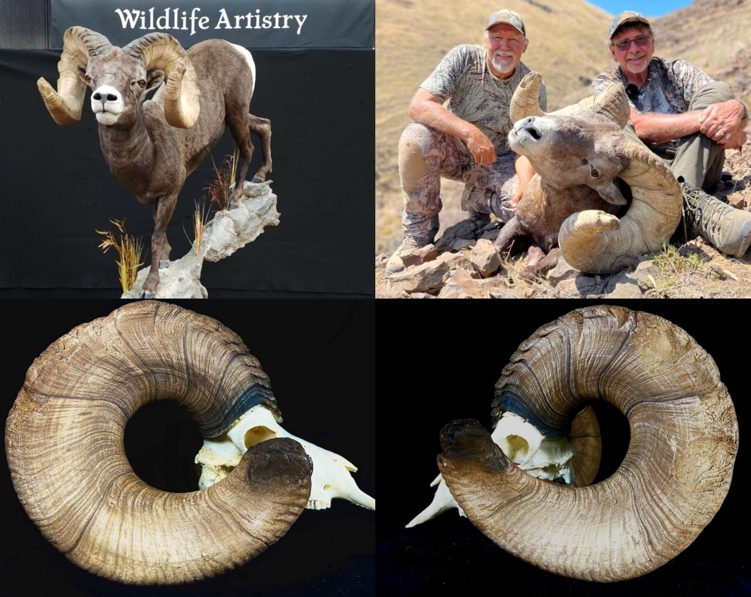 Mike Kinney is donating, a European replica of his 2022 New World Record Oregon State California Bighorn Ram, scoring a whopping 191 4/8. It was taken in the John Day area of Oregon with John McCollum of Eden Ridge Outfitters.