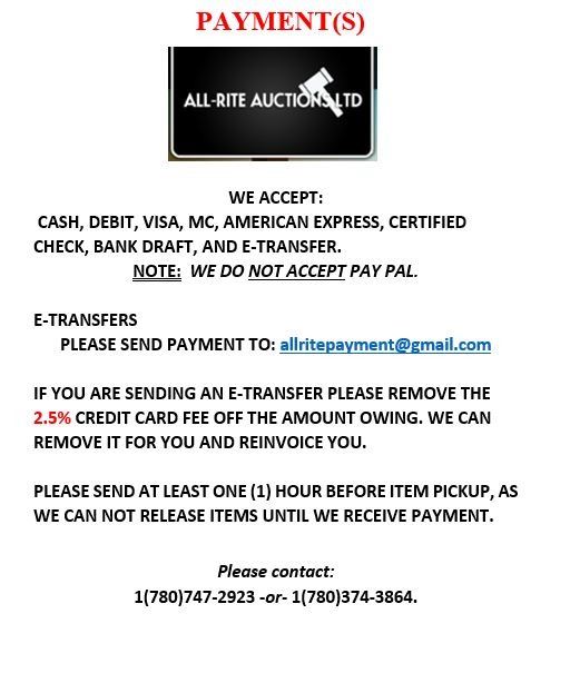 It is the purchaser's sole responsibility to make any necessary inquiries and to inspect the item before placing a bid. Additional viewing is available by appointment, please contact All-Rite Auctions at 1-780-747-2923 or 1-780-374-3864.