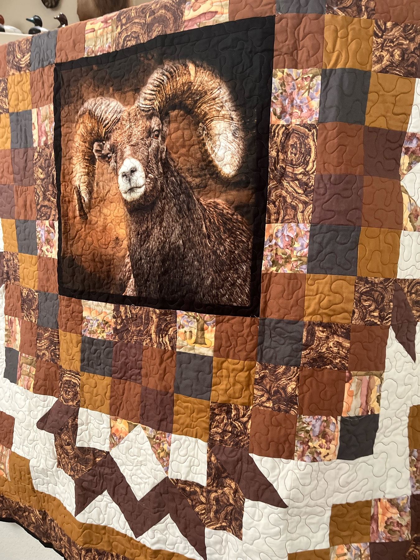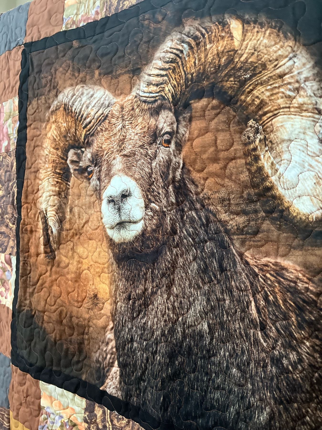 Crafted by Susan Martin-Costales at approximately 60x60 inches. You will never find a better representation of both the bighorn sheep and the art of quilting.