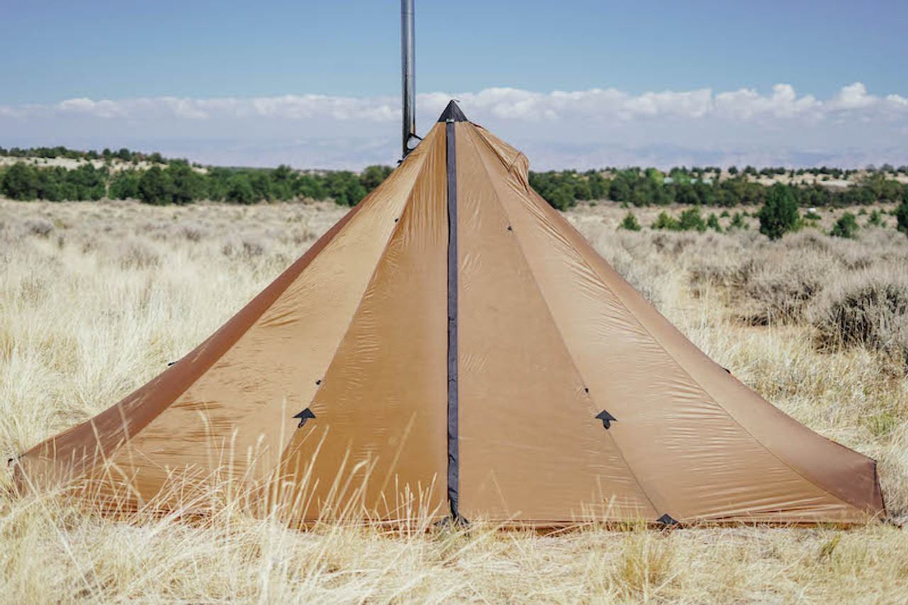 The Redcliff shelter is a durable and lightweight option for 3 to 6 people who need a standing height tent. The built-in stove jack makes it possible to use a wood stove inside. The Redcliff weighs in at 5lbs 3oz with stakes and pole.