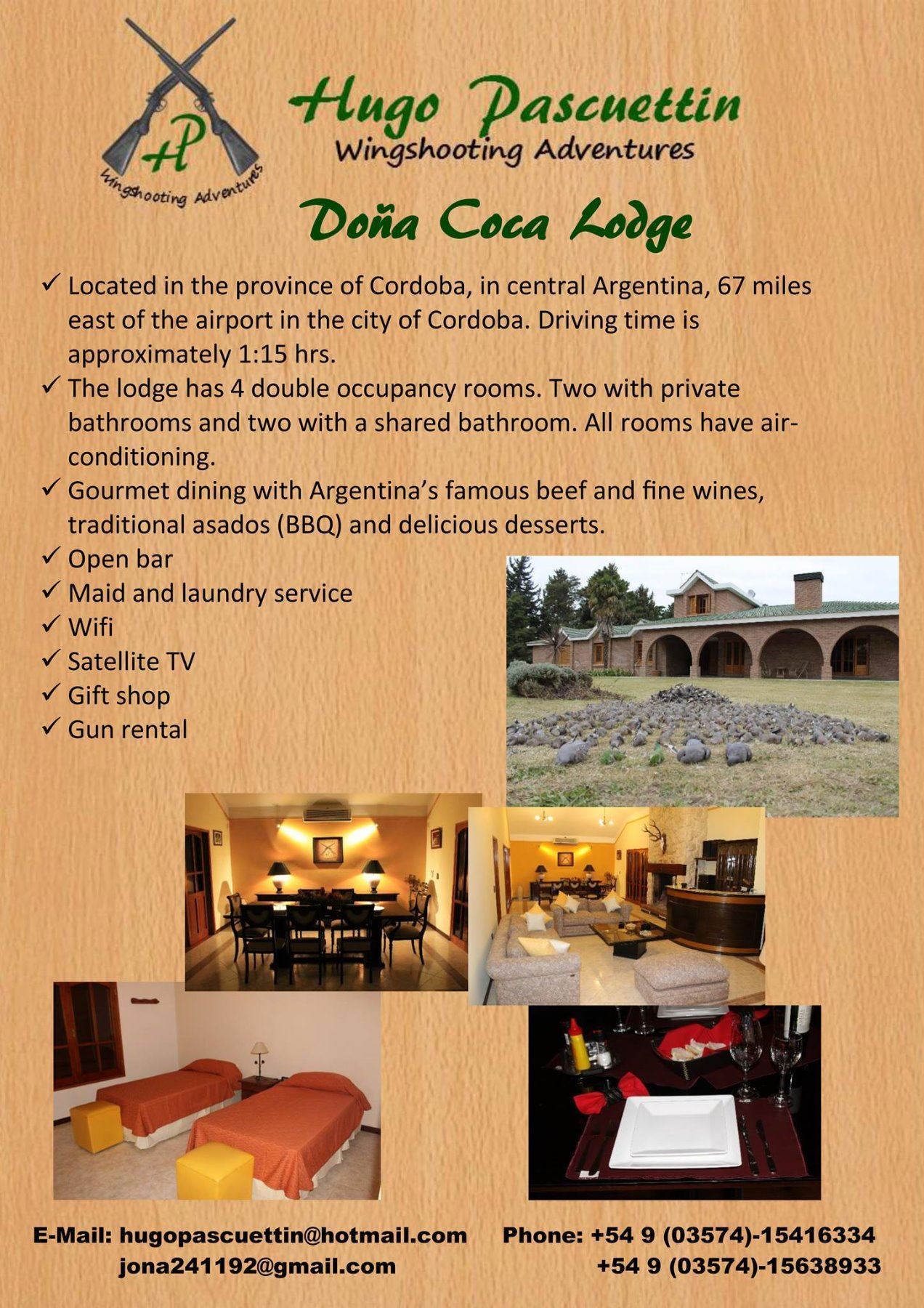 For more information, please contact Debbie Gomez in Florida at 786-243-3170 or debabhunts@bellsouth.net. You can see the company website at http://hpwingshooting.wixsite.com/inhunting