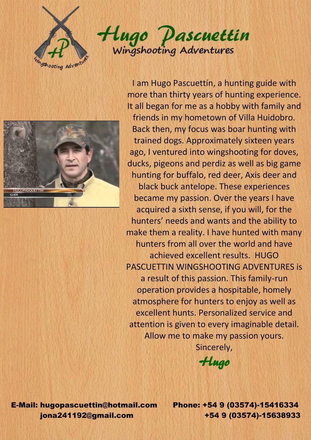 Hugo Pascuettin owner of HP Wingshooting Adventures is offering a 4 Day Unlimited Dove Hunting adventure for 4 hunters[/b].