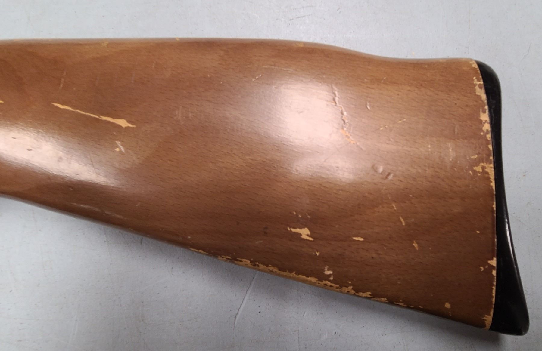 Wood stock has finish lifting in various spot but wood is sound. No cracks .