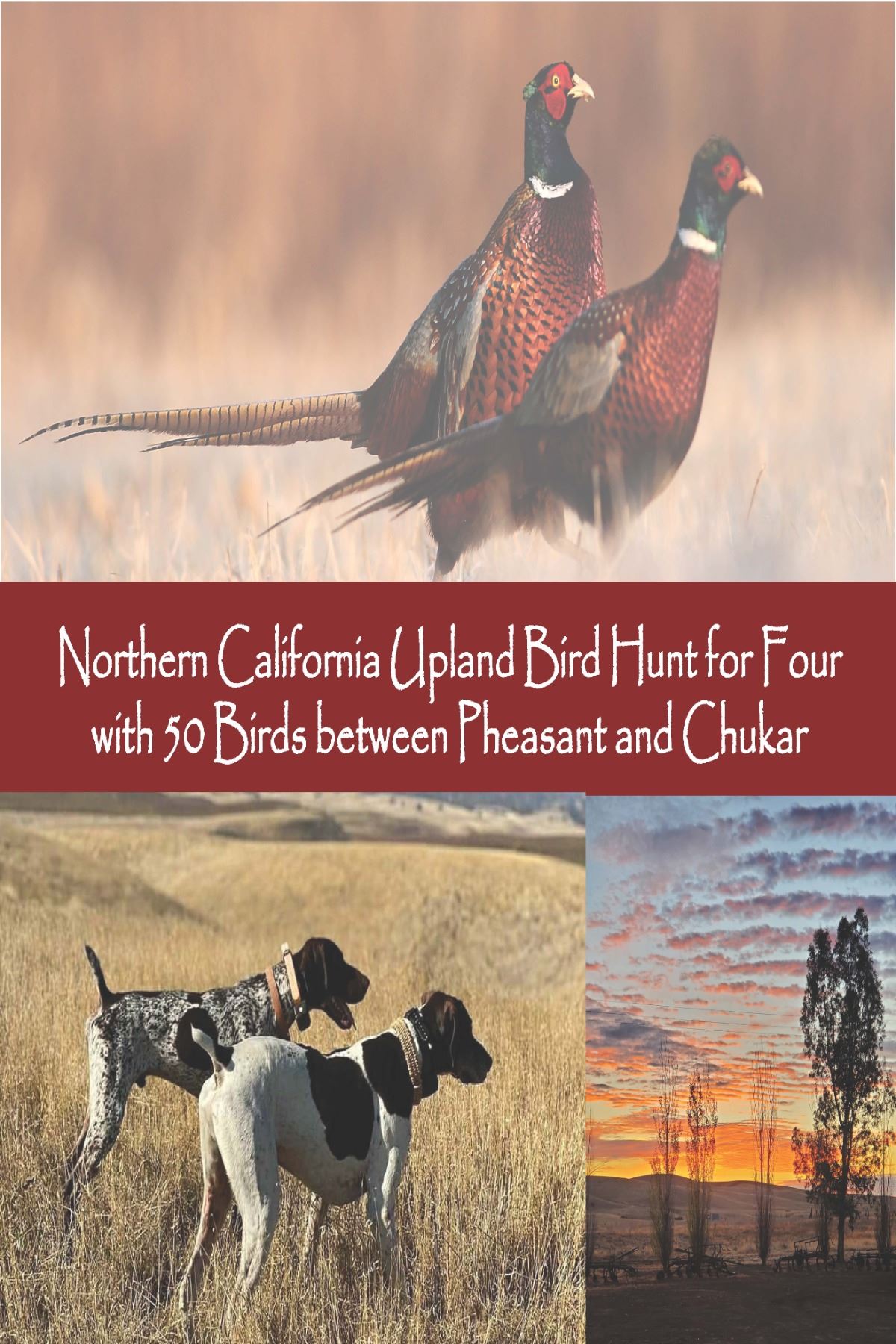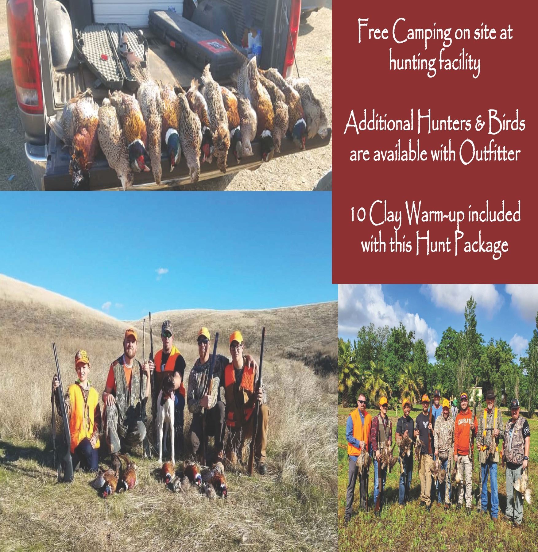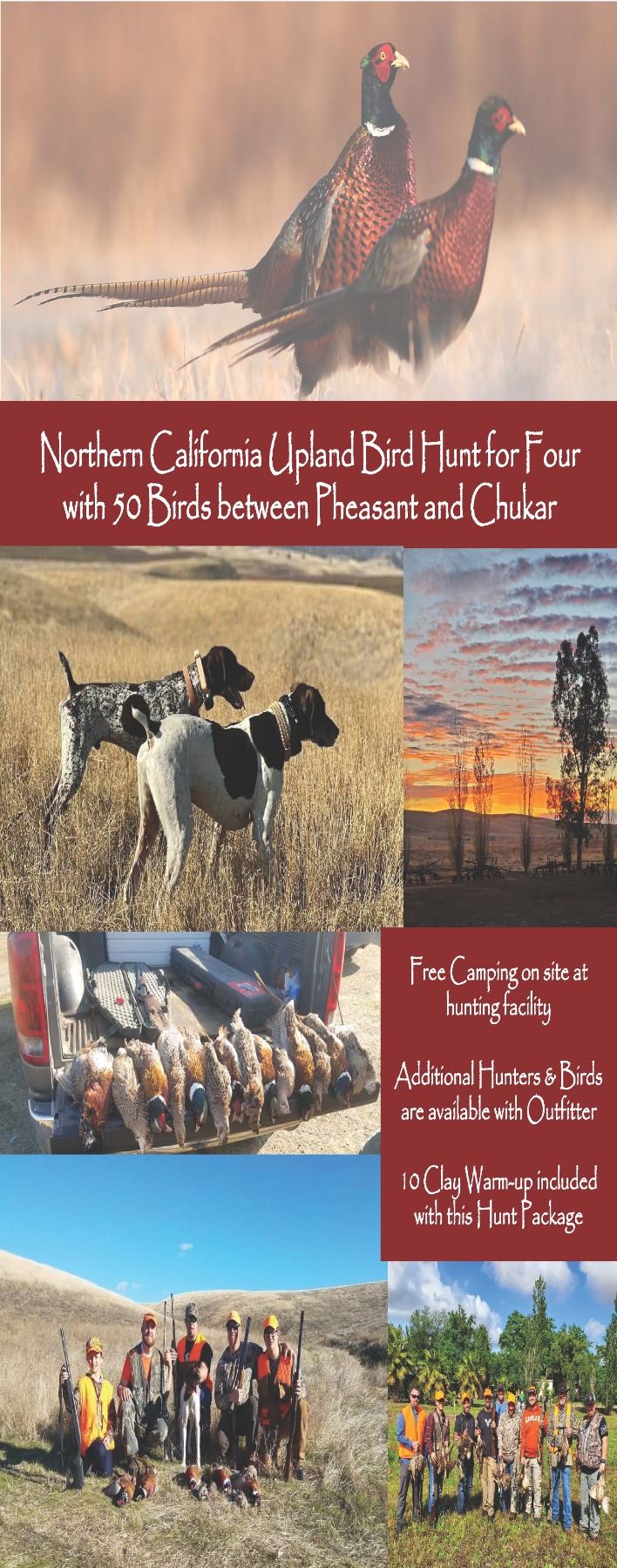 One Day Hunt Includes (for up to 4 people): CA-03 Northern California Pheasant & Chukar Hunt for up to Four Hunters Self-guided Pheasant Hunt for up to Four hunters Ability to bring your own dog or hire one and a handler from the lodge Fifty (50) total birds between Pheasant and Chukar (hunter's choice) Transportation of any birds desired to a local, reputable taxidermist Warm-Up of 10 clays per hunter before heading out to the field Opportunity to add additional hunters & additional birds Ability to enjoy the sporting clay course ($42 for a round of 100 clays [lead ammo okay for clays]) Free camping on site at the hunting facility
