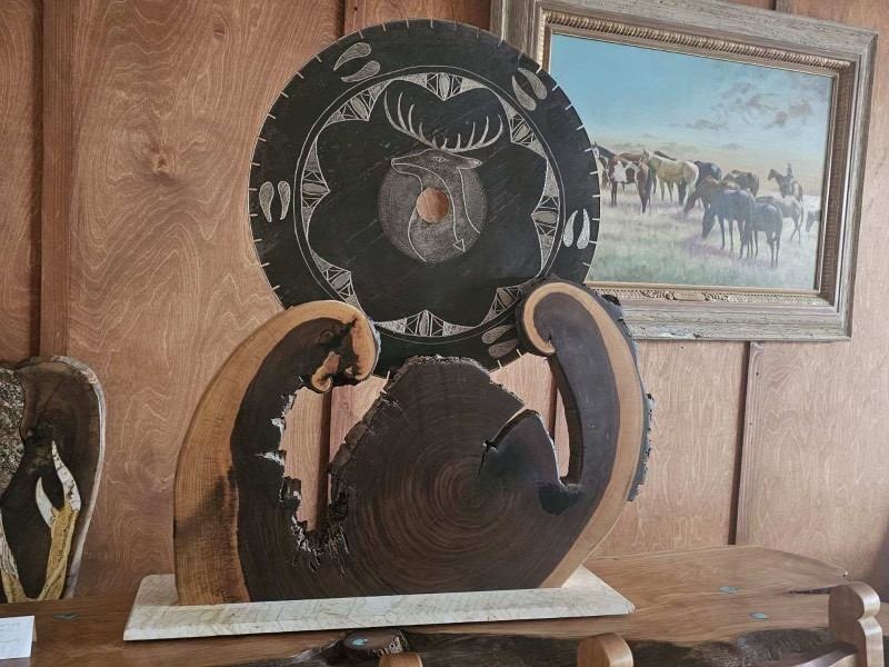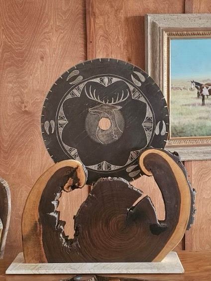 and Deer designs on the other sits on Beautiful 30” wide x 24” high Black Walnut Stand.