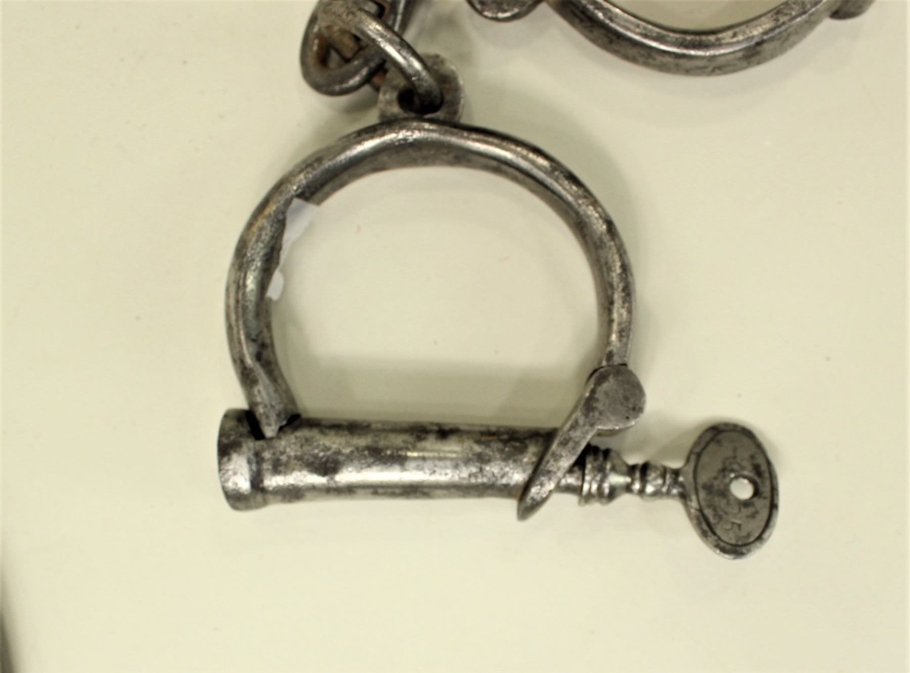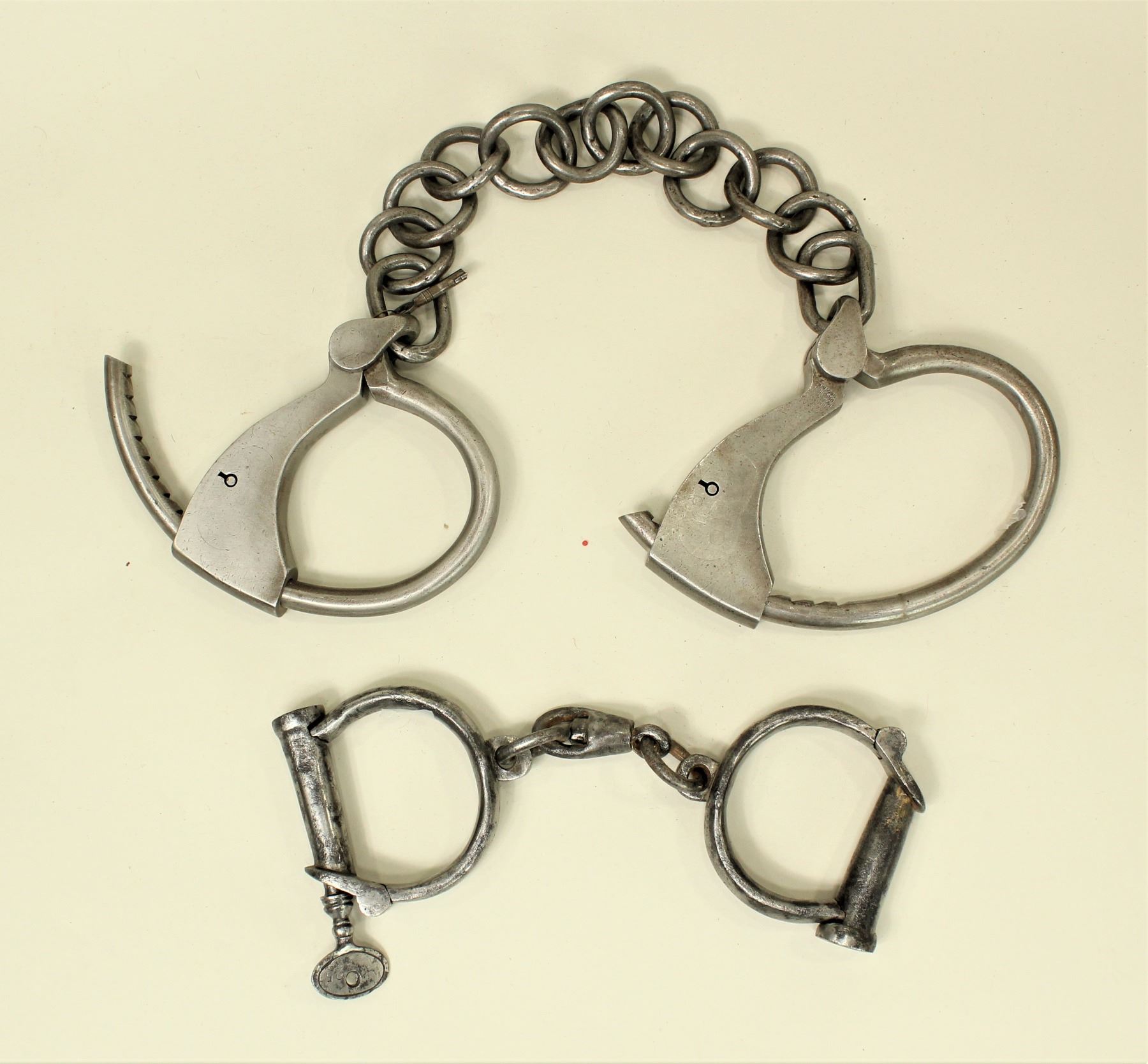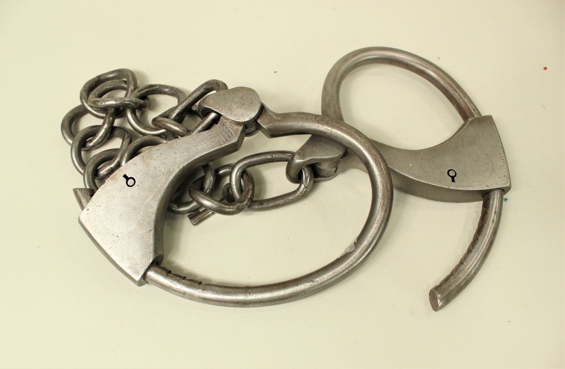 Two pairs of heavy steel handcuffs, complete with their keys.