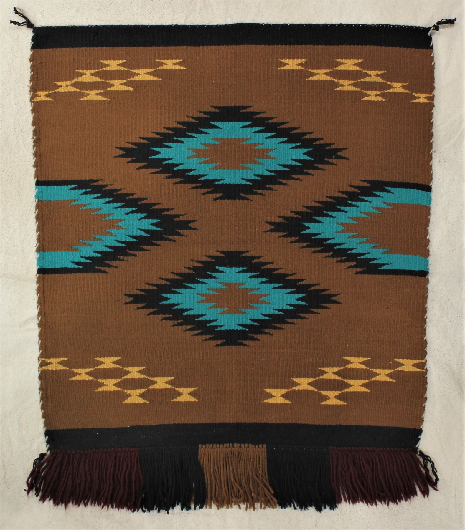 A crisp nicely done saddle blanket with uncommon colors, measuring 28"x 35", circa 1950.