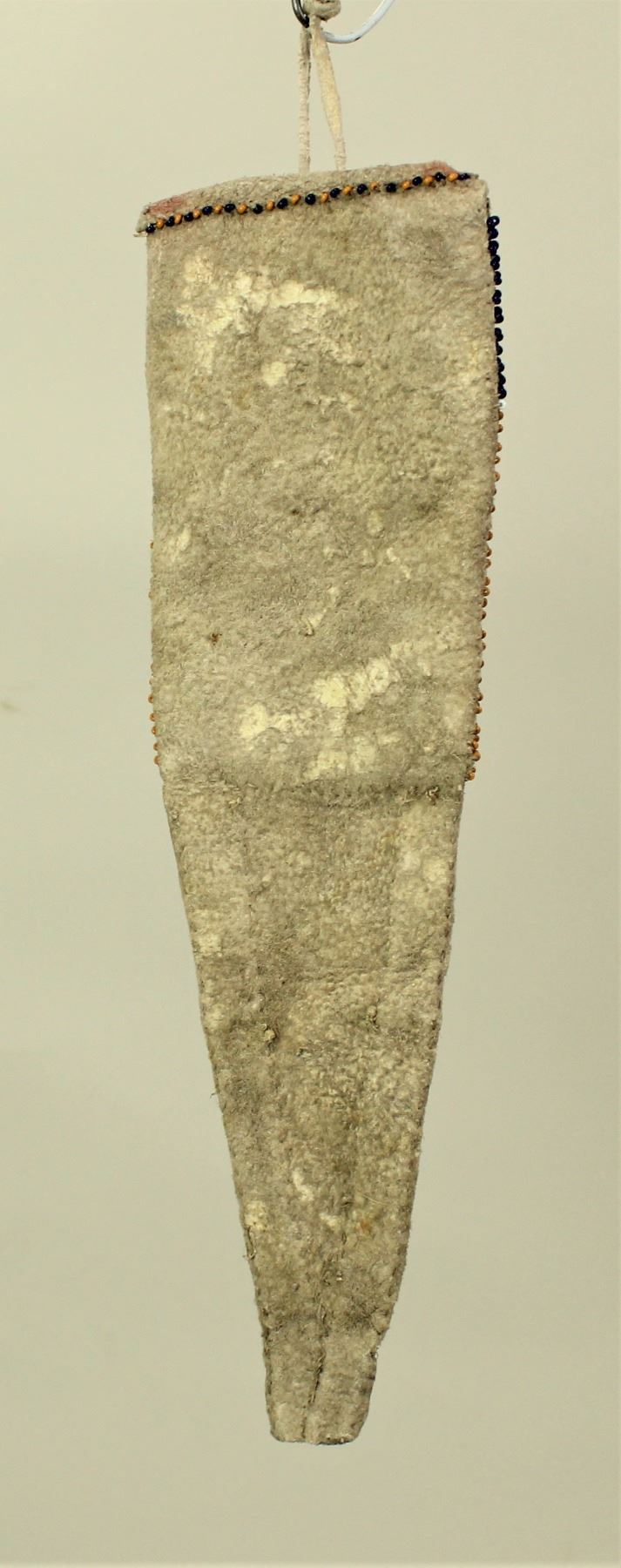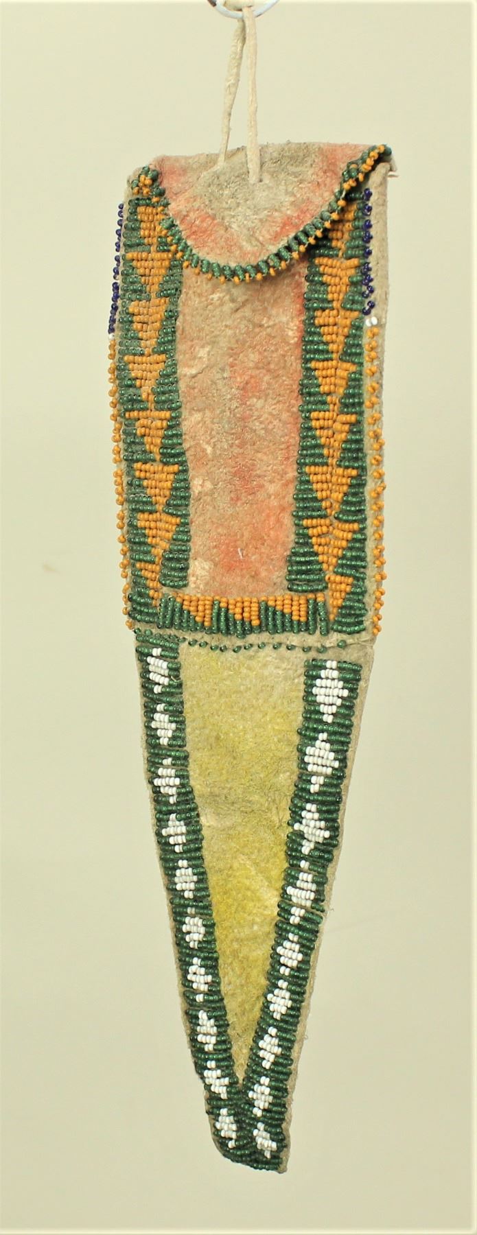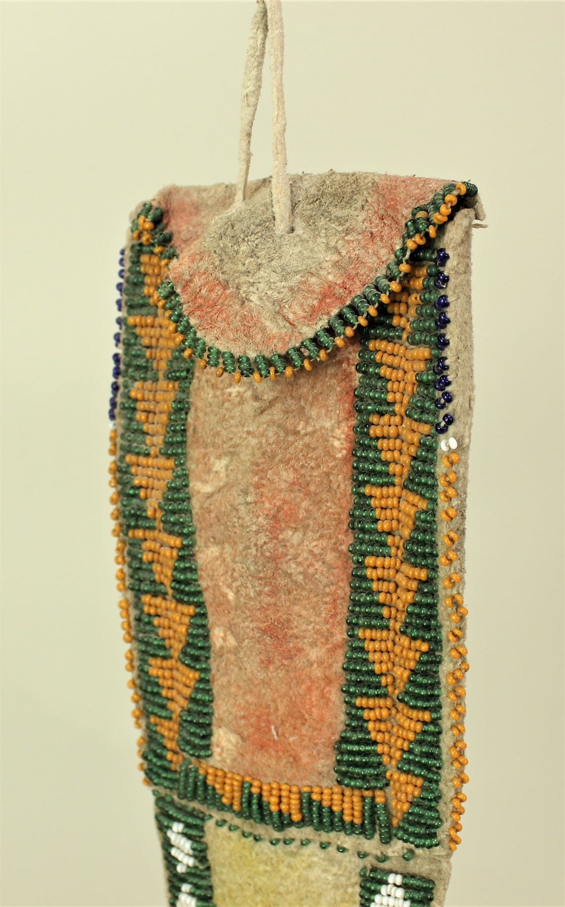 An interesting beaded case on buckskin, with strong red and yellow ocre color, and a finely detailed pattern of pumpkin, green and white beaded border. Measuring 3"x 10".