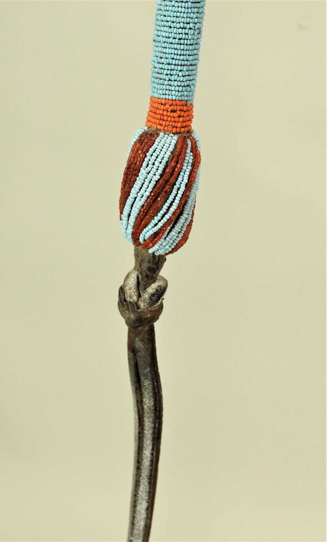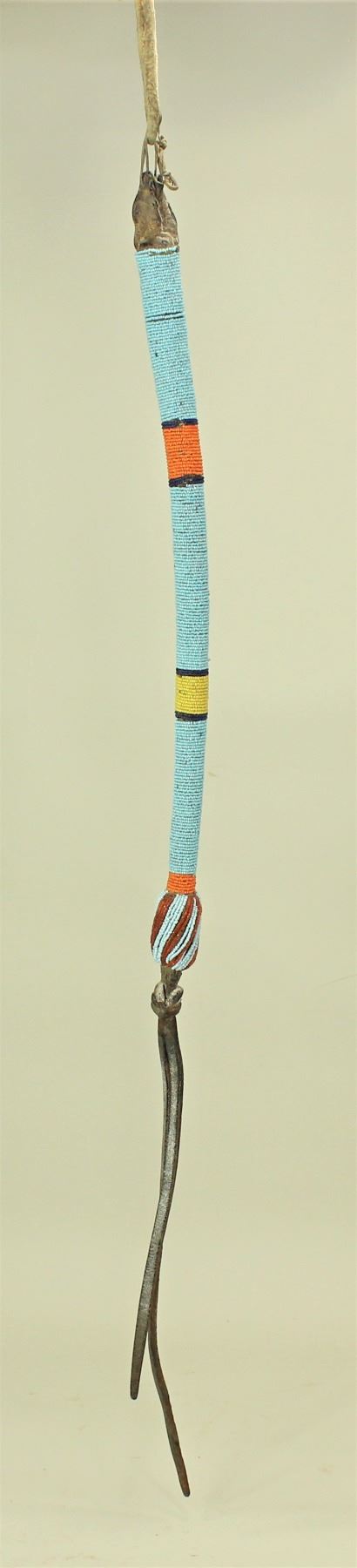 An intriguing weighted leather bound quirt, fully beaded from end to end using yellow and orange beads on a robin egg blue background. Measuring 35" including its original popper.