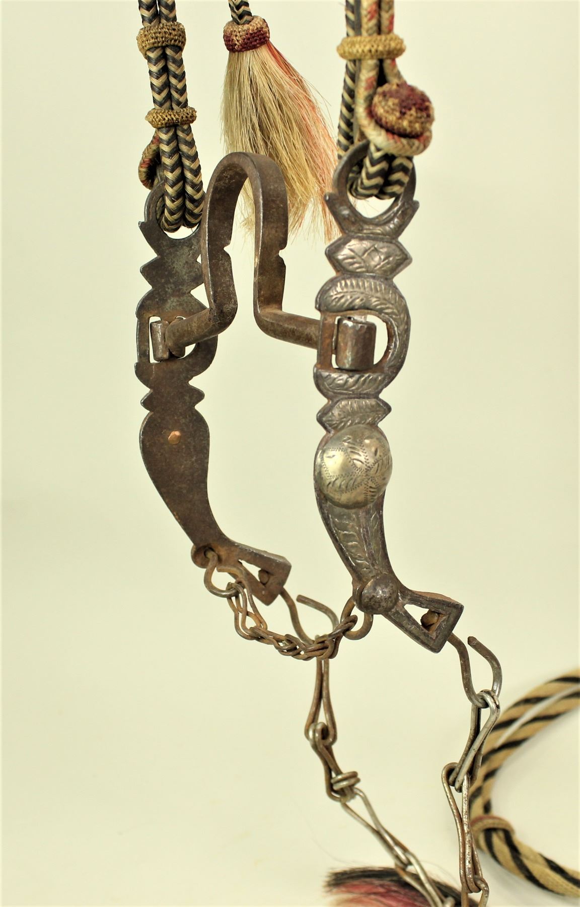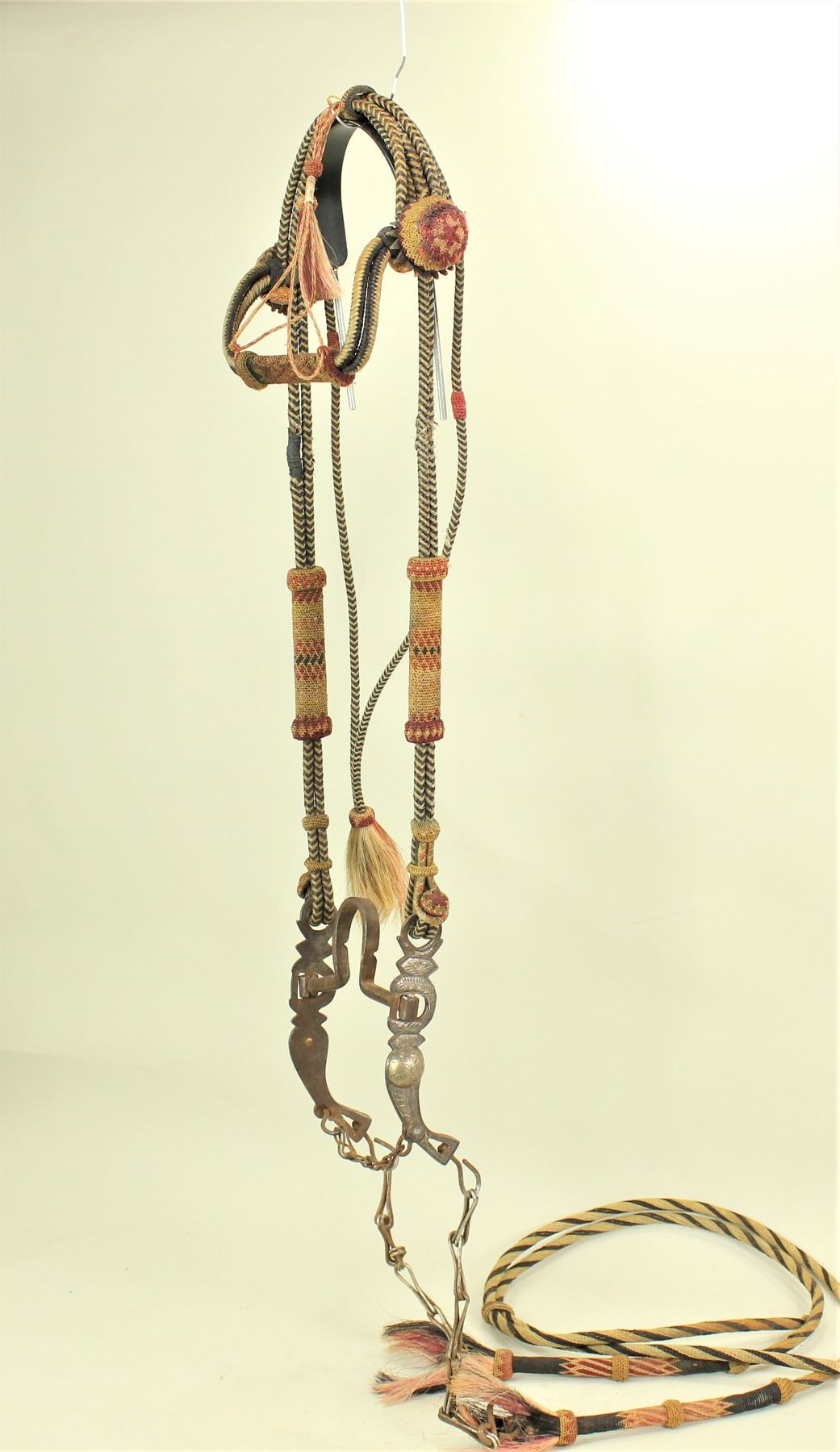 A pleasing four color hitched horsehair bridle done in the Yuma Arizona prison, showing its characteristic style of cheeks and large needle knot domed rosettes, accompanied by a very attractive silver loose jaw high port-mouth bit. And hitched horsehair split reins.