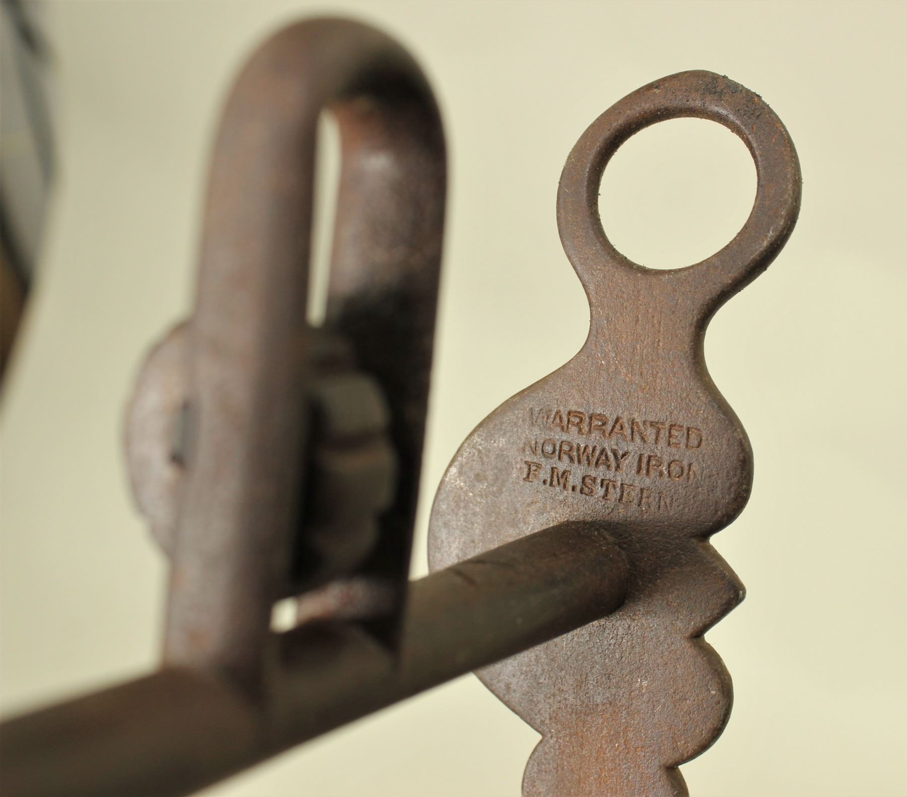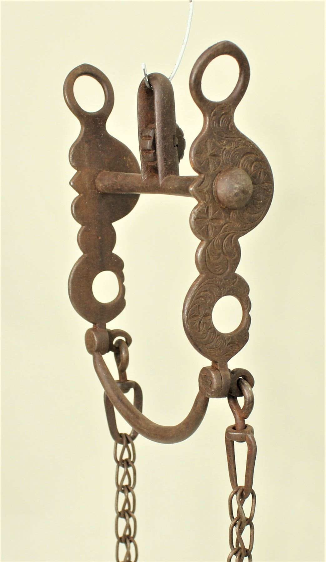 Very early California style kissing bird tall halfbreed bit with finely engraved iron, rein chains, and great Norway Iron maker's mark.