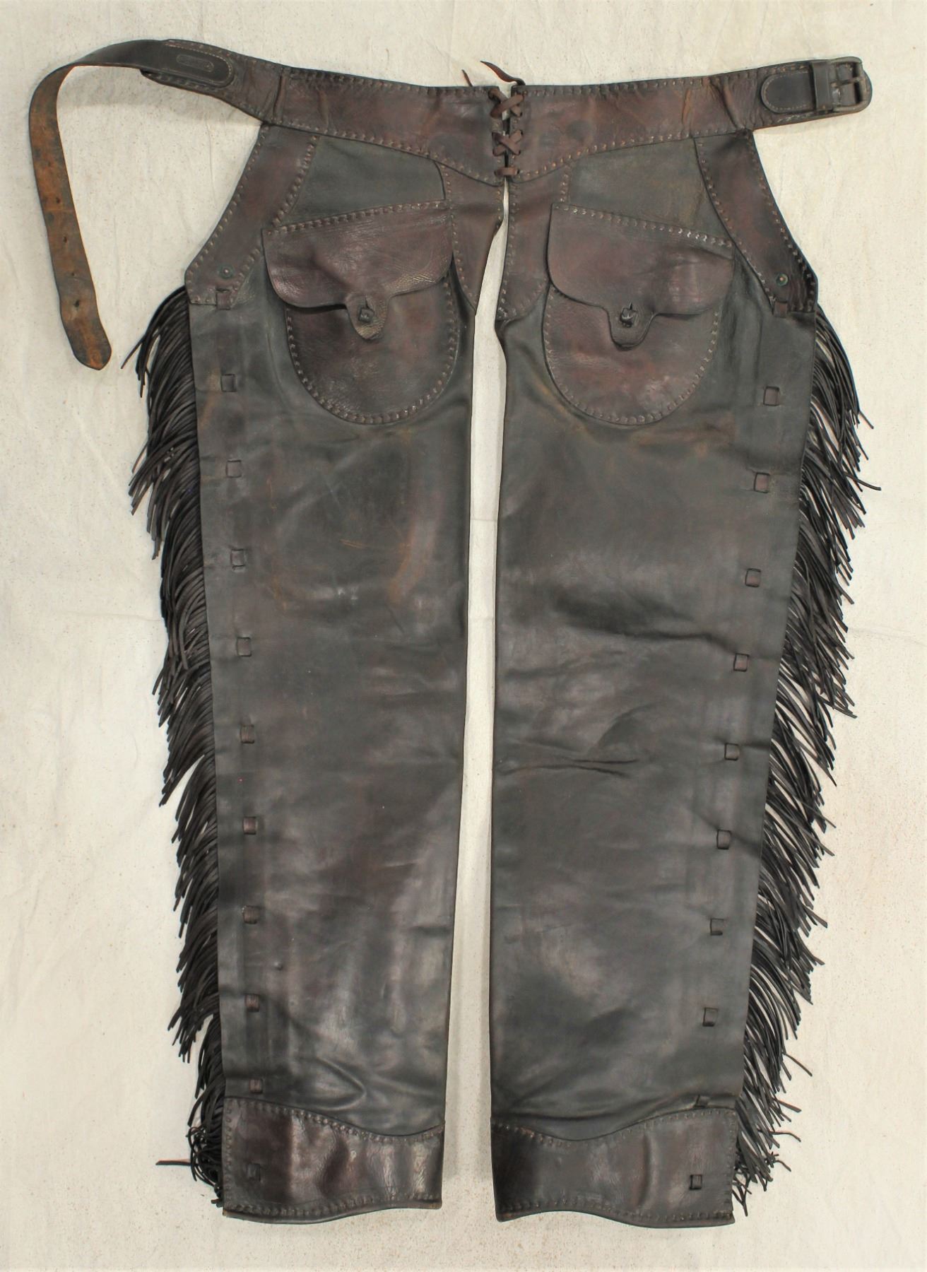 A super pair of early fringed step-in style chaps with nicely marked straight belt, having fantastic eye appeal, color and condition.
