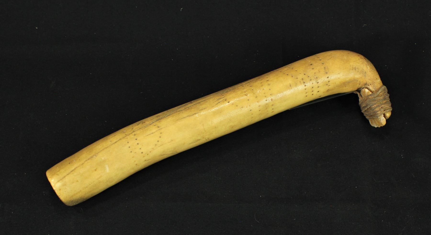 Beautifully worn and patinaed elk antler hide scraper with great decoratively incised markings, and leather bound stone blade.