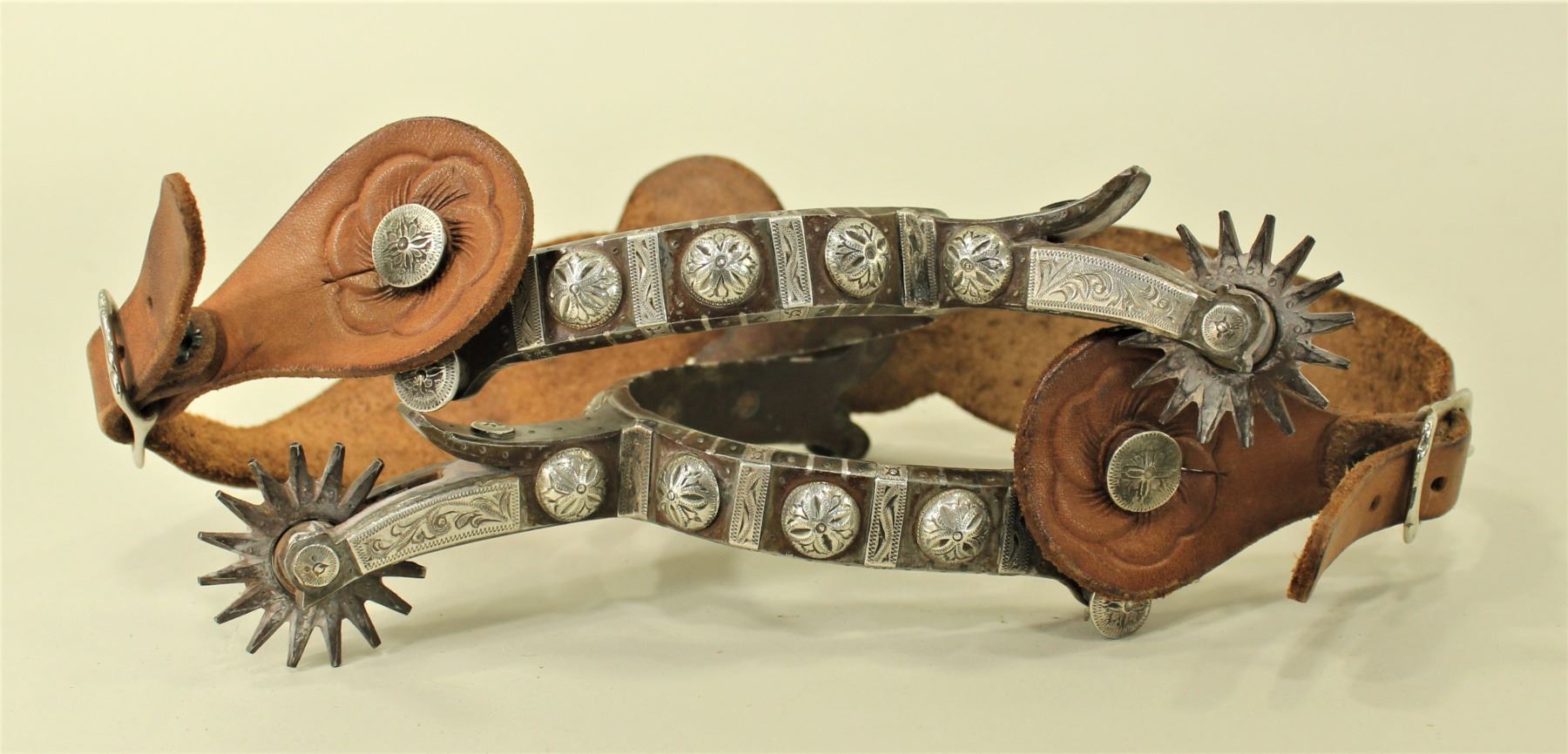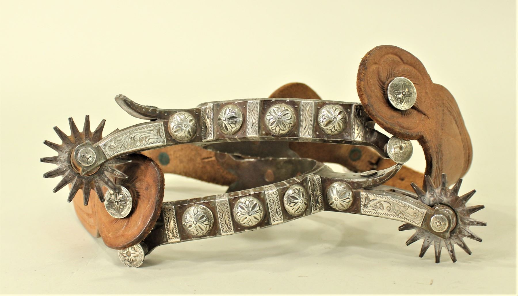 A magnificent pair of double mounted Wyoming style spurs, using Rex Schnitger characteristics, with beautifully engraved domes separated by stripes, turned-up chap guards, and split heelbands. Completed by their original straps.