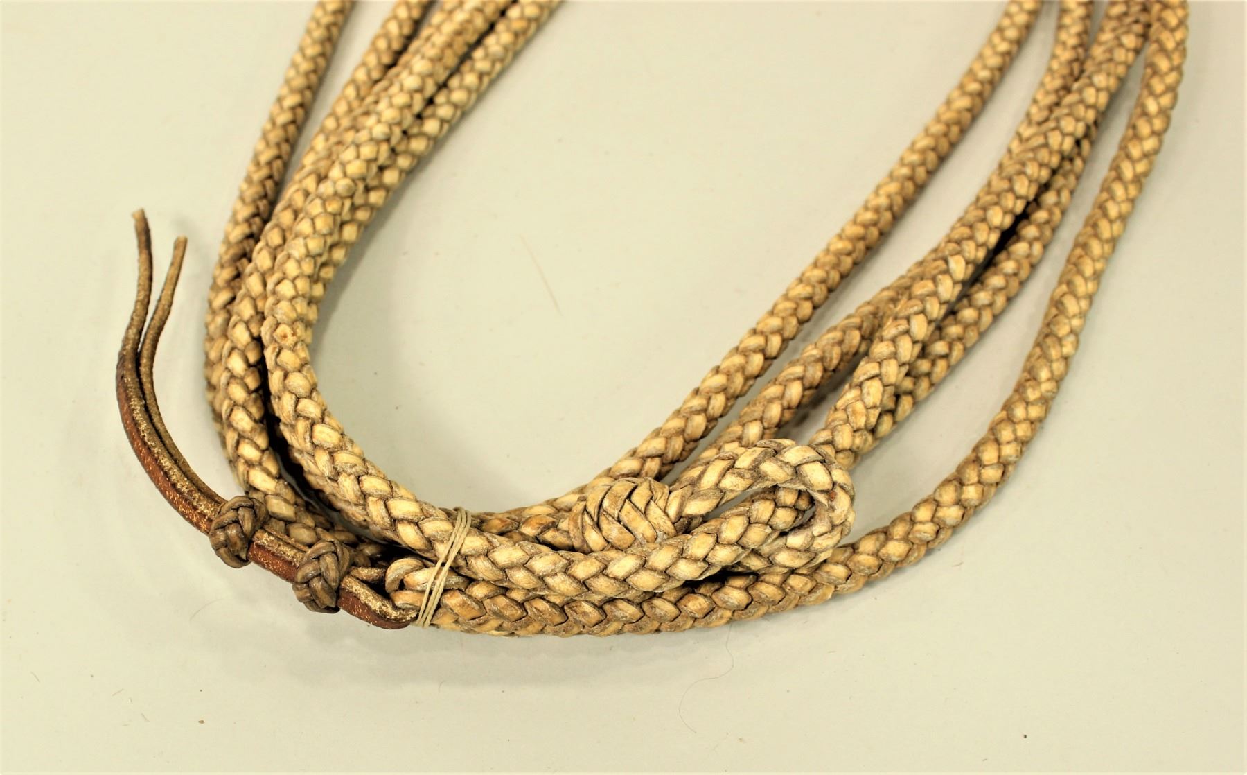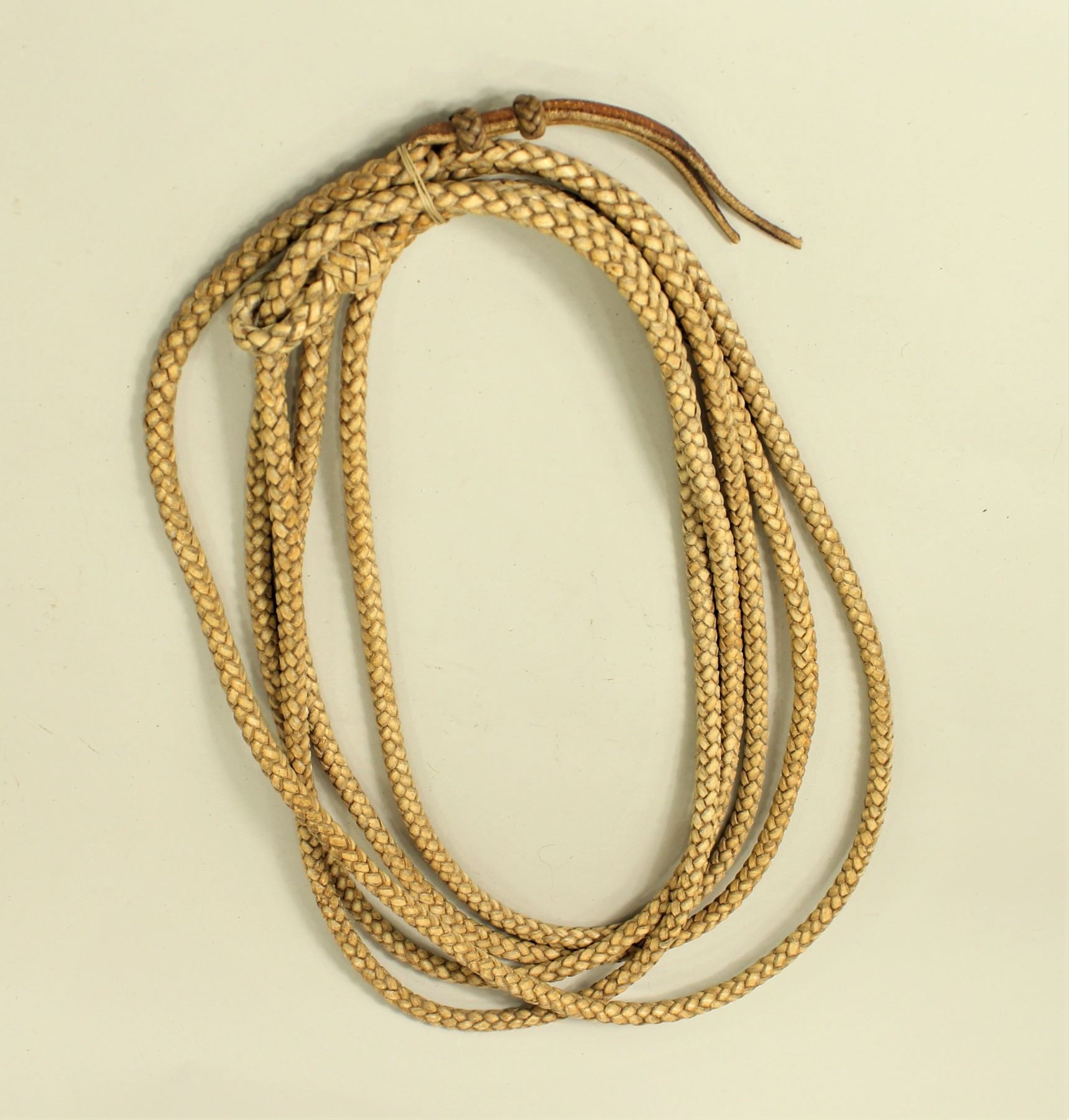 An extra fine 30 foot long 6-plait braided rawhide show rope, with all the elements of Luis Ortega, displaying a great hondo, finely finished end and rich color.