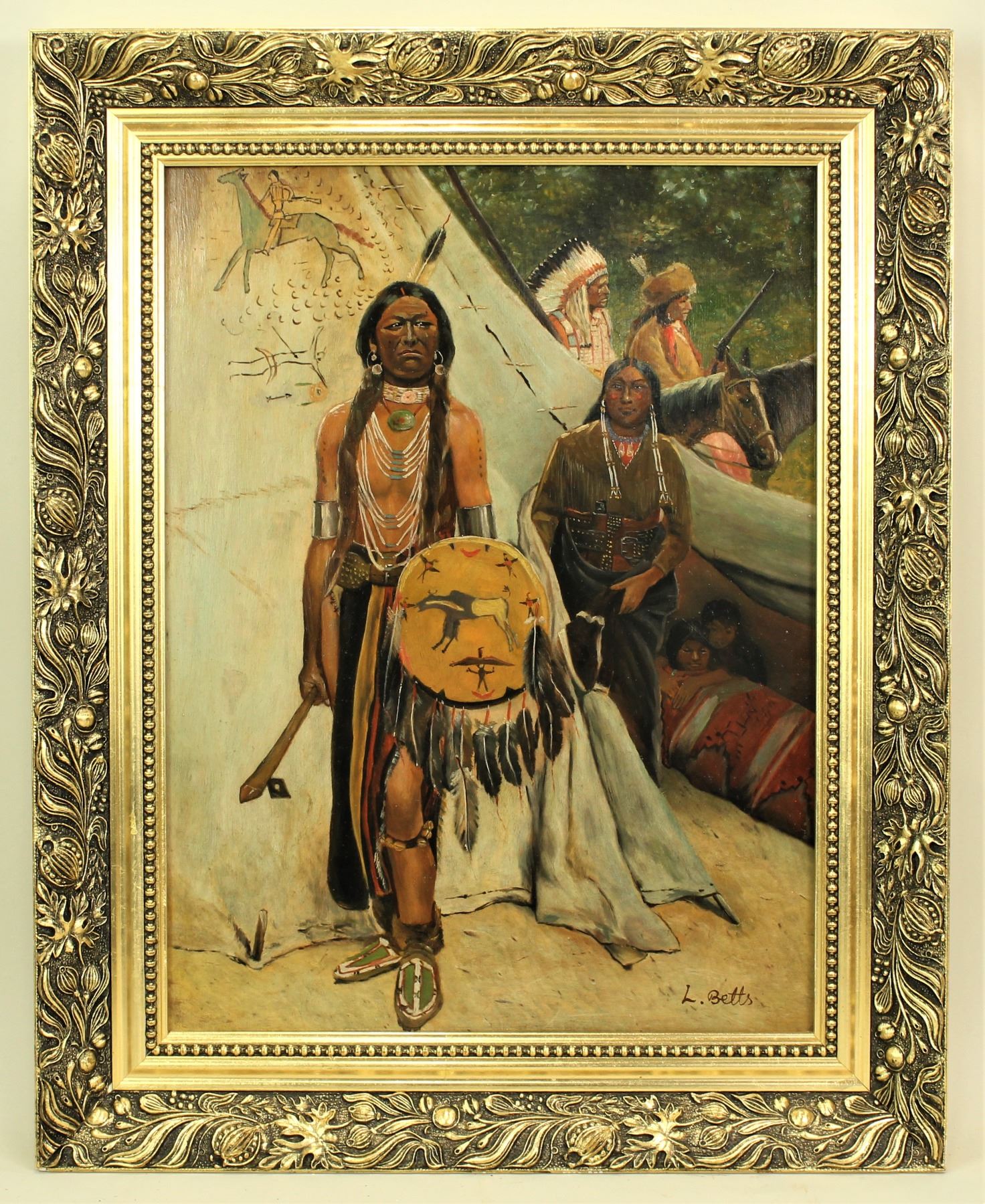 Original oil painting on board, signed lower right, L. Betts, influenced by the Cincinnati school and Henry Farney. With great presence and composition, subject matter and authentic dress and weapons. Image measuring 12"x16".