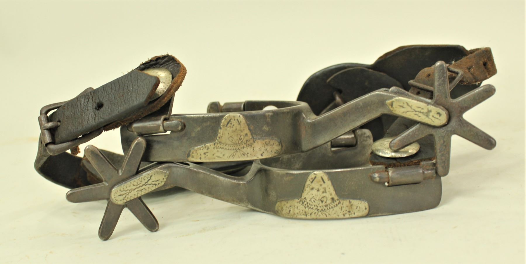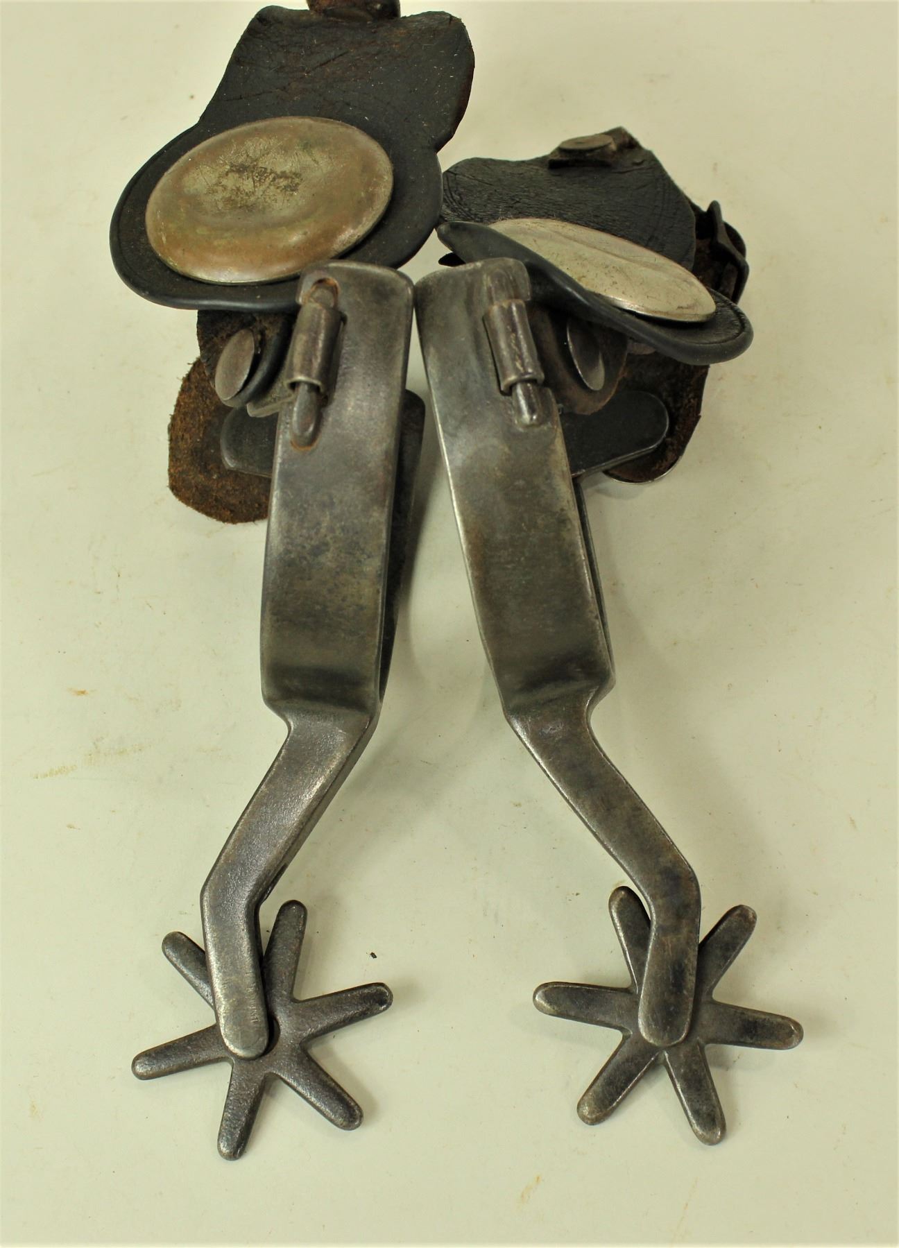Great looking pair of single mounted Inside marked "Red River" pattern spurs with 6-point rowels, swinging buttons, and nice marks.