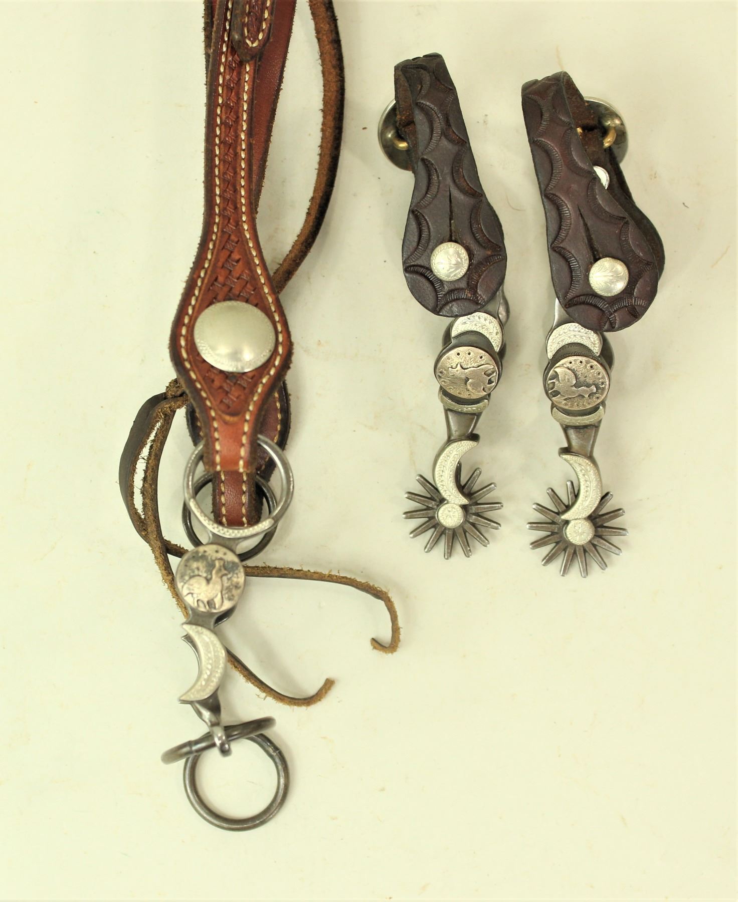 An incredible matching set by the master himself, Jerry Wallace. A dainty pair of double mounted McChesney Peacock spurs with a matching bit, mounted in a Dallas Schribner silver mounted headstall.