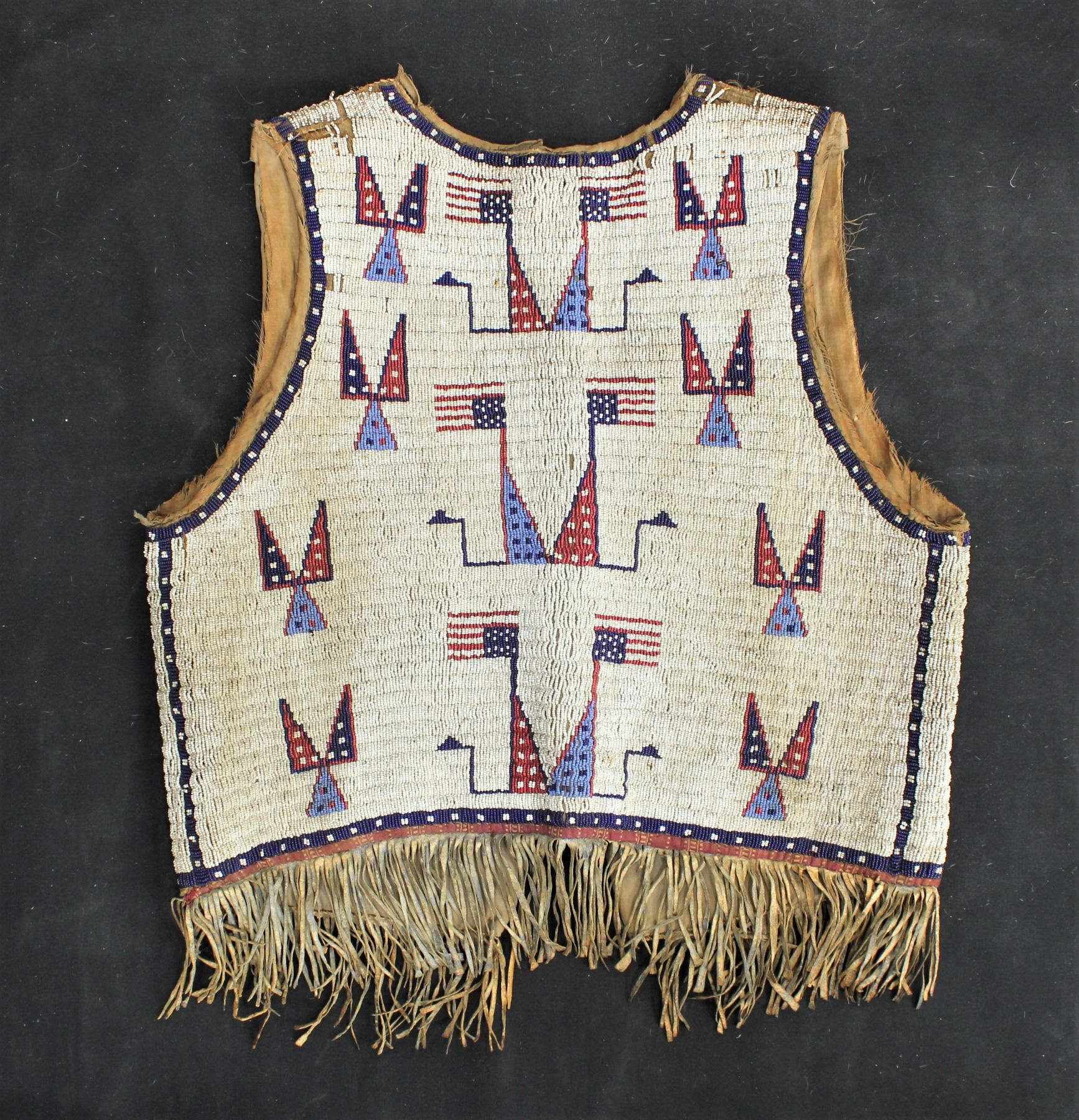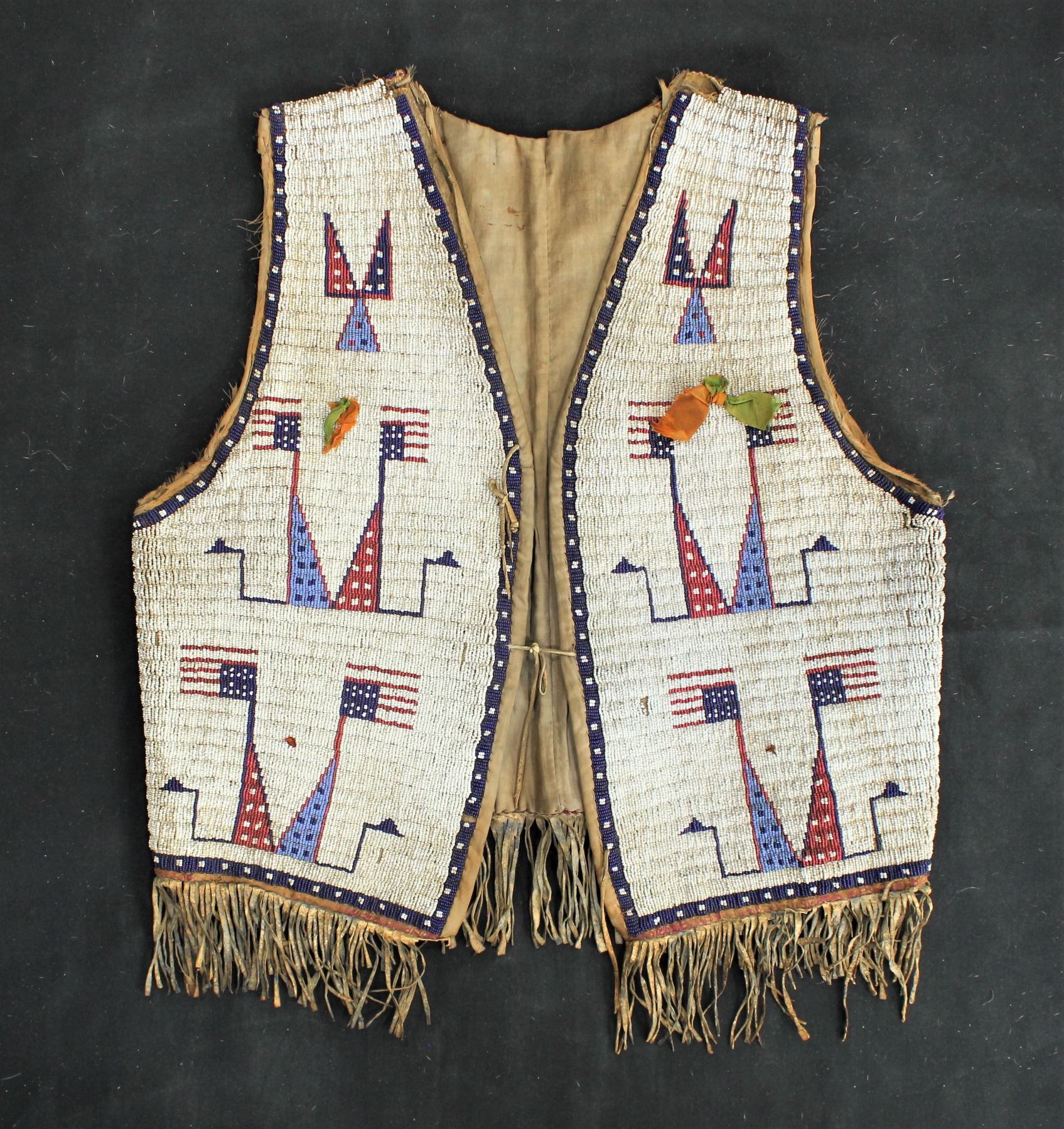 A Sioux fully beaded man's size vest with a stunning patriotic pattern of 14 American flags intricately beaded into a cobalt blue bordered white background, lined with cloth and accented by ribbons and a nicely fringed bottom. Showing very good overall condition with a couple wear spots.