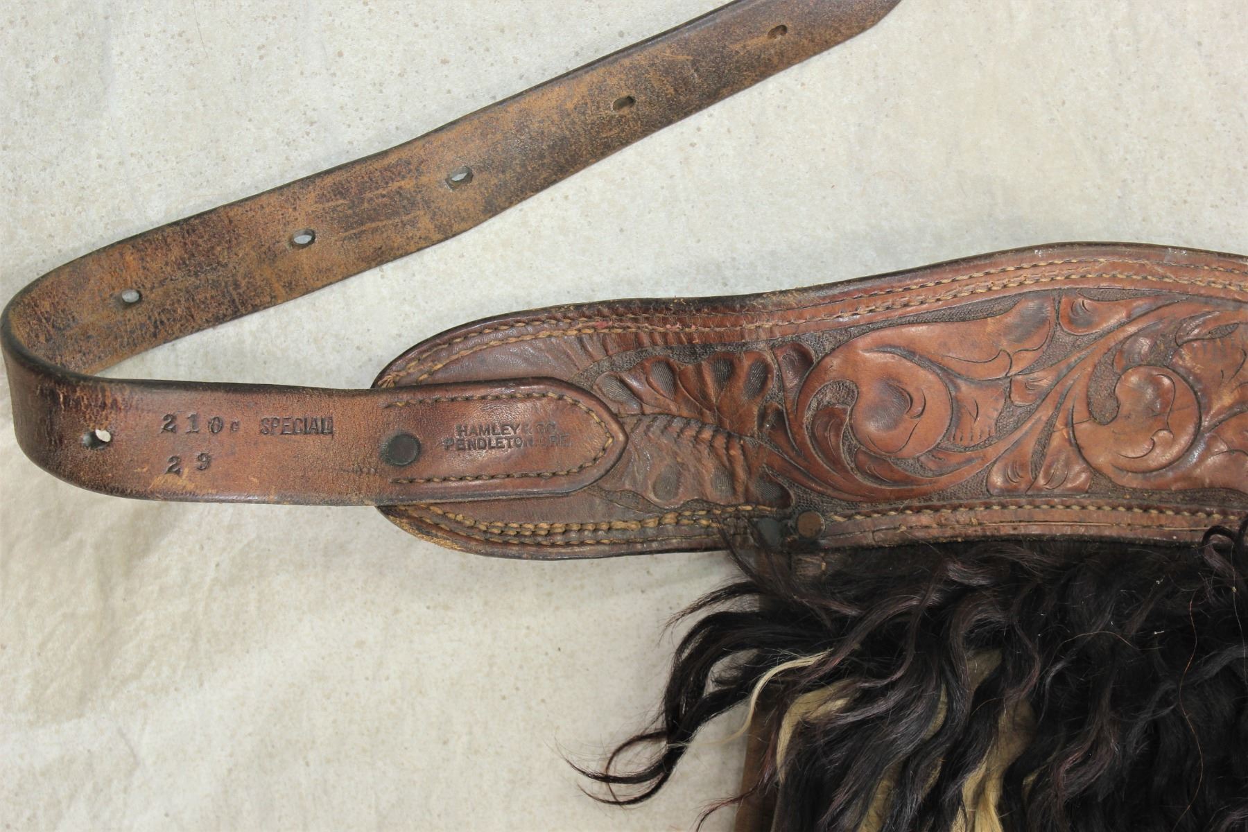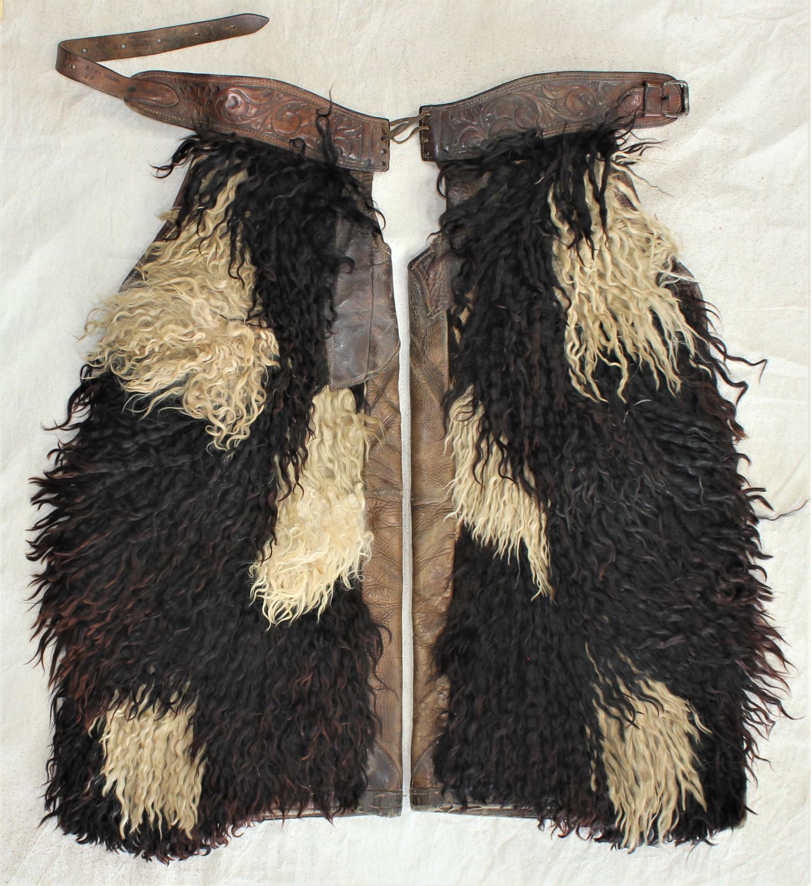 An exceedingly rare pair of large angora chaps with thick black and white long twisted hair, flower tooled belt and well maker marked belt. In good overall condition with leather patched crotch area.