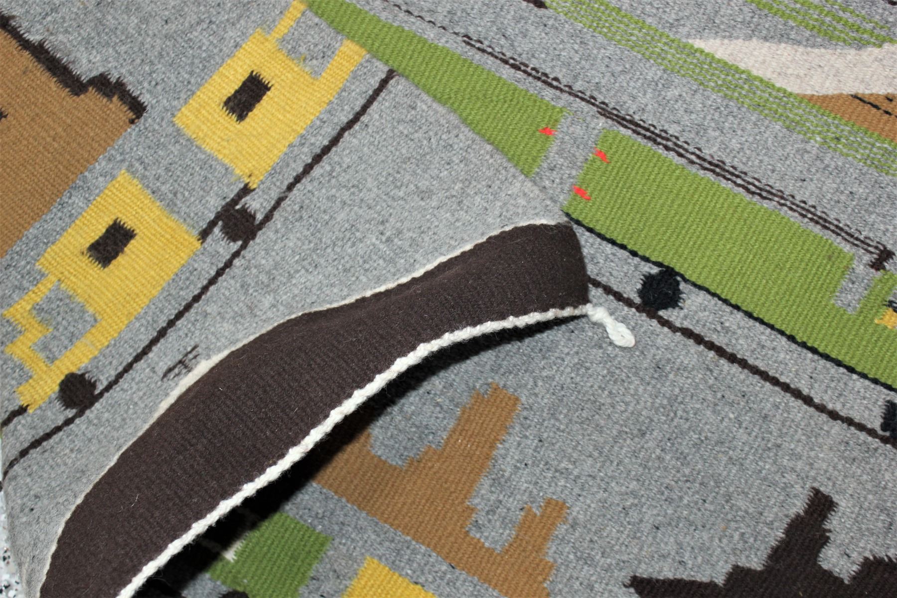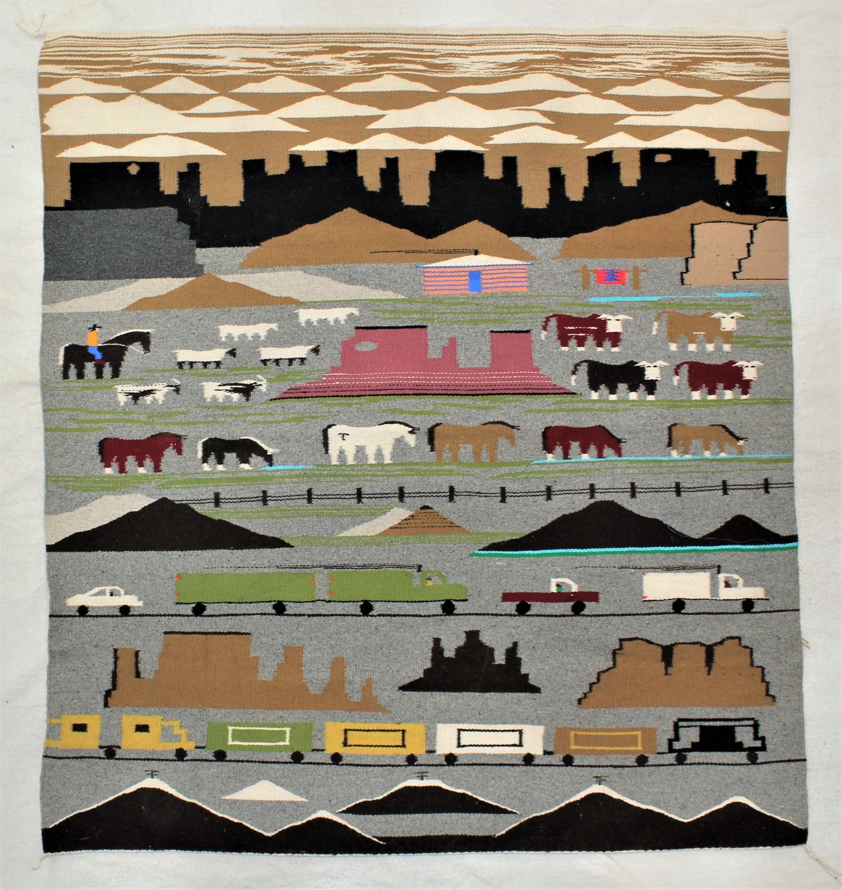 A wonderful large pictorial rug with a full detailed display of ranch life in New Mexico, with a horseback rancher tending his herd of goats, sheep, cattle and branded horses behind the hills of trains and trucks in the foreground, all with a majestic mountainous skyline in the background. With a great size, measuring 50"x 55".