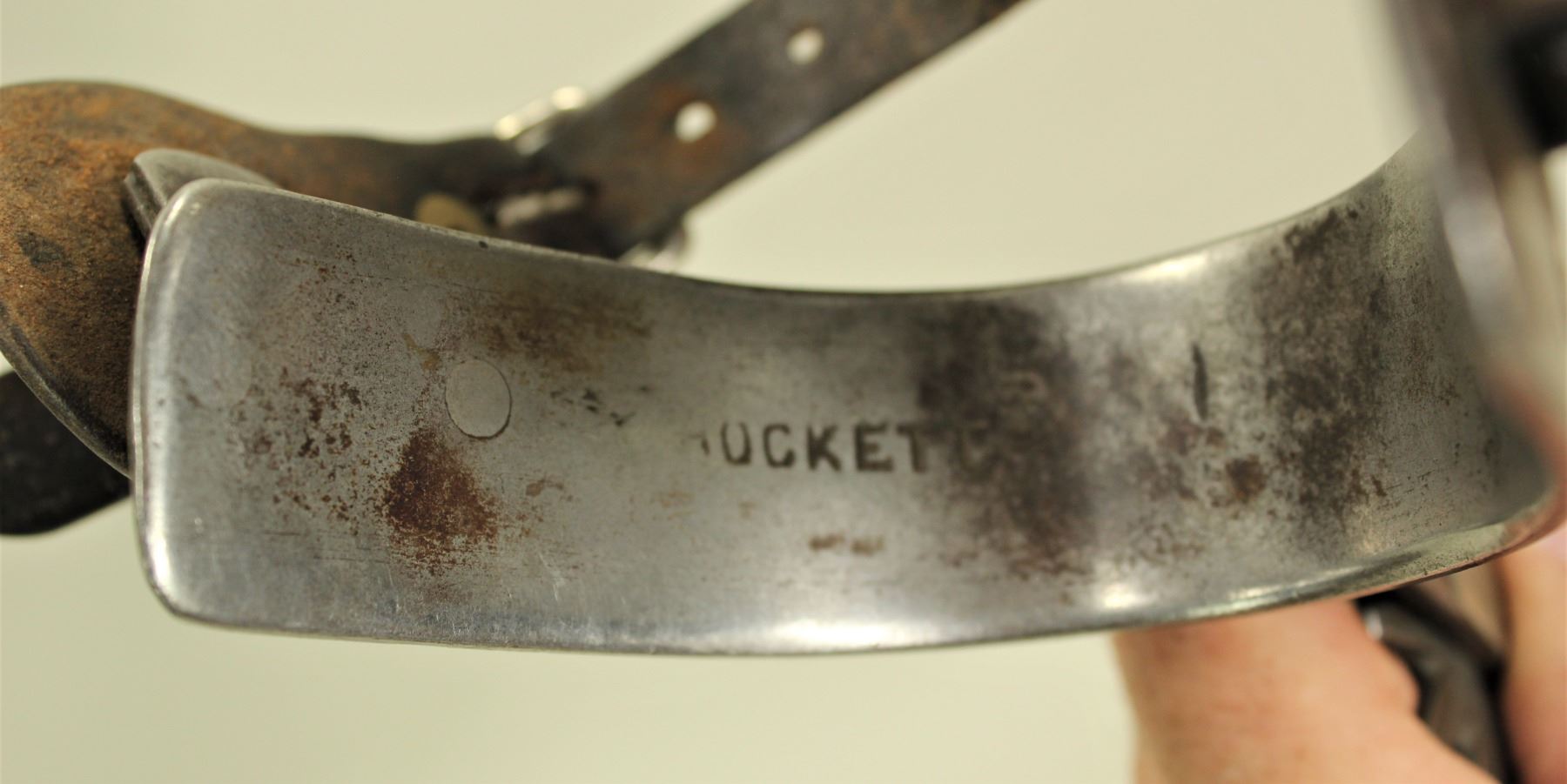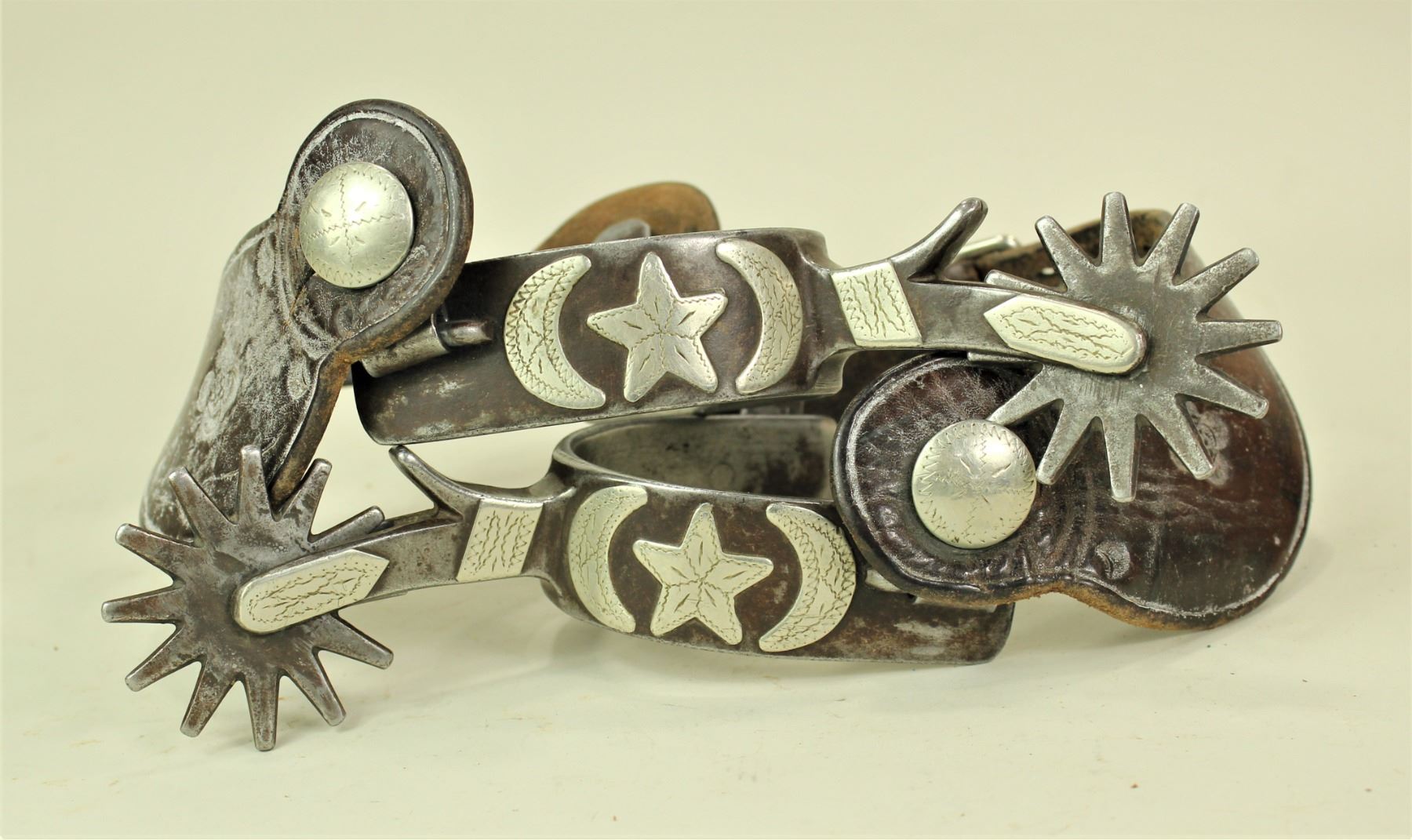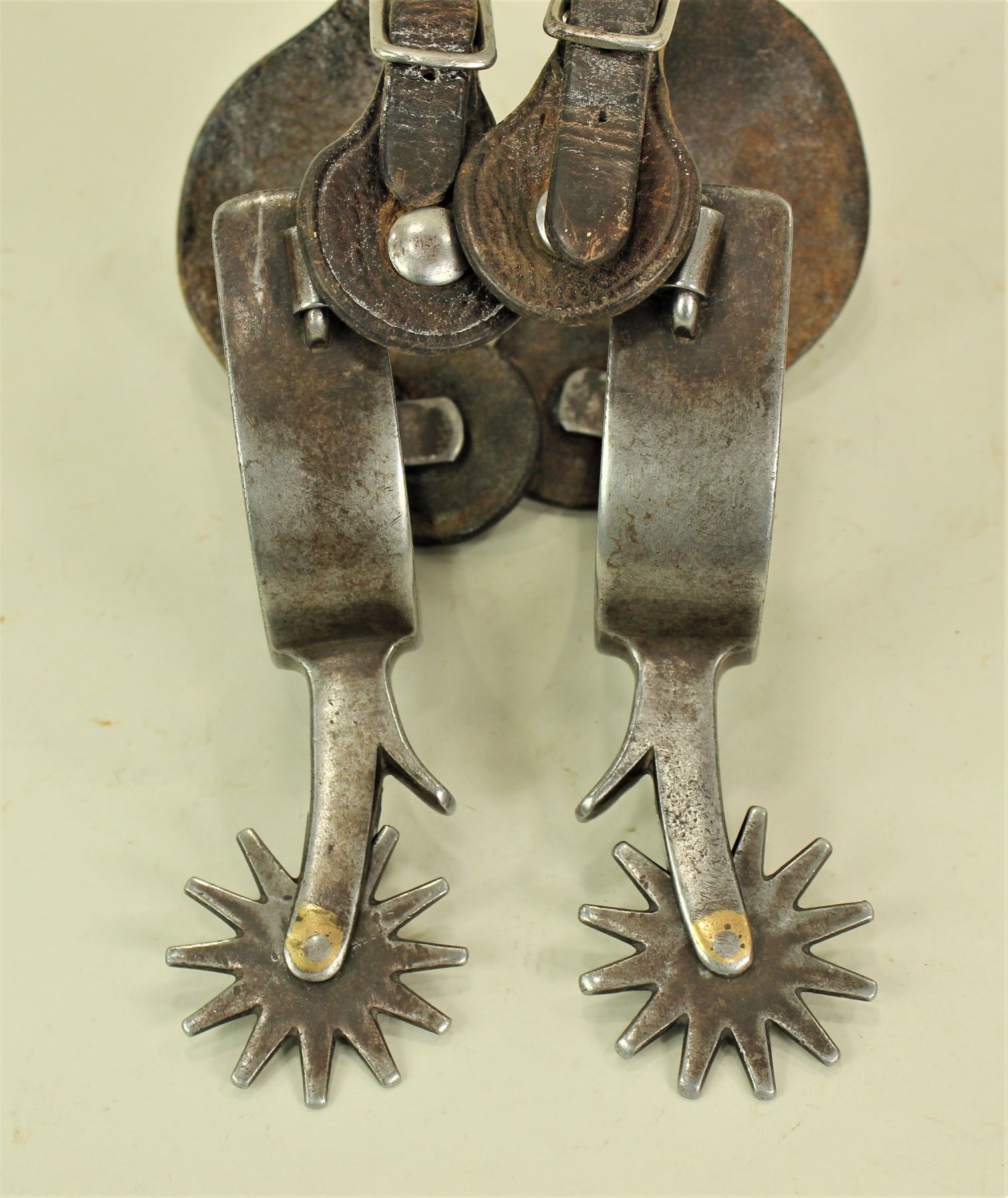 A large pair of Beason Special pattern single mounted spurs with fantastic eye appeal and patina, showing early style Oscar Crockett engraving and finished with original straps. Marked nicely inside the heelbands.