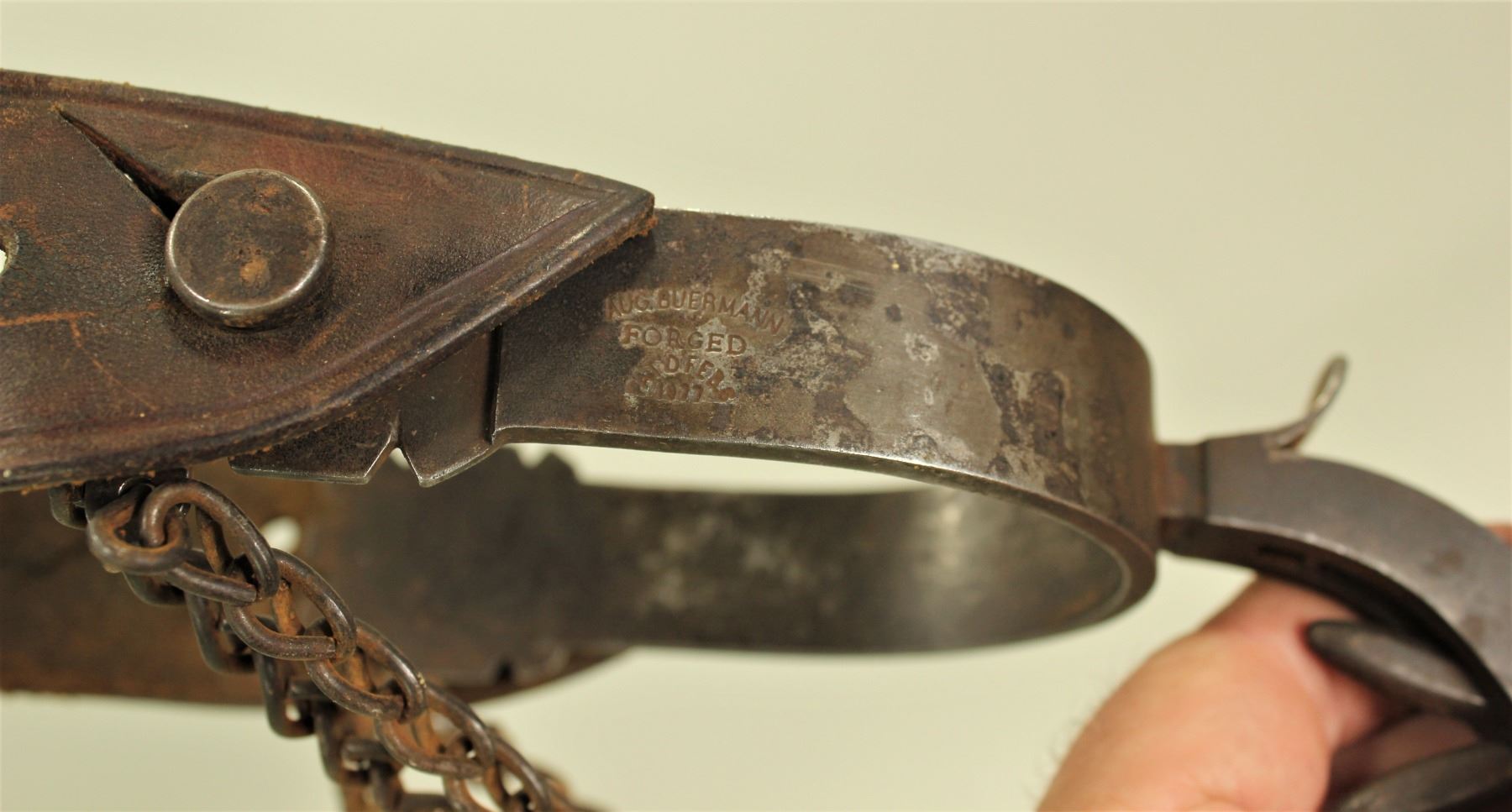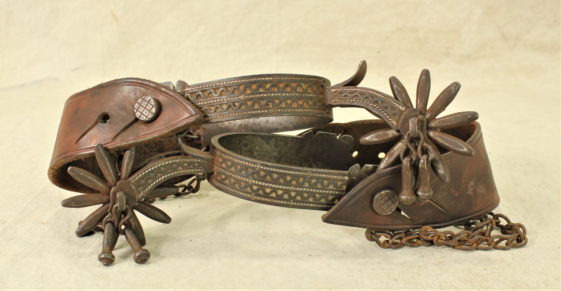 An extremely scarce pair of massive iron spurs with deeply engraved iron and fine twisted silver wire inlay, with huge rowels, jingle bobs and dove wing straps. Beautifully marked and showing great patinaed condition.