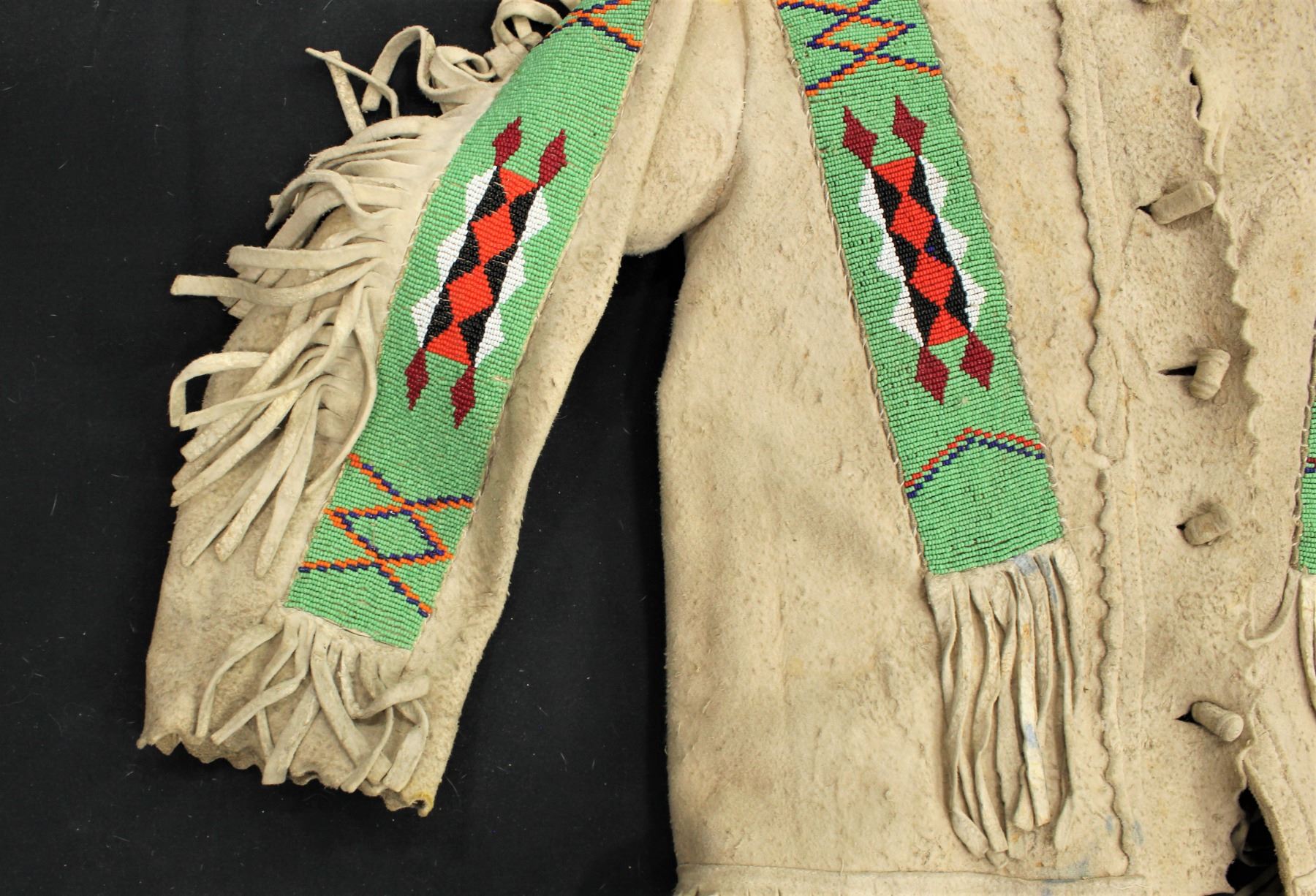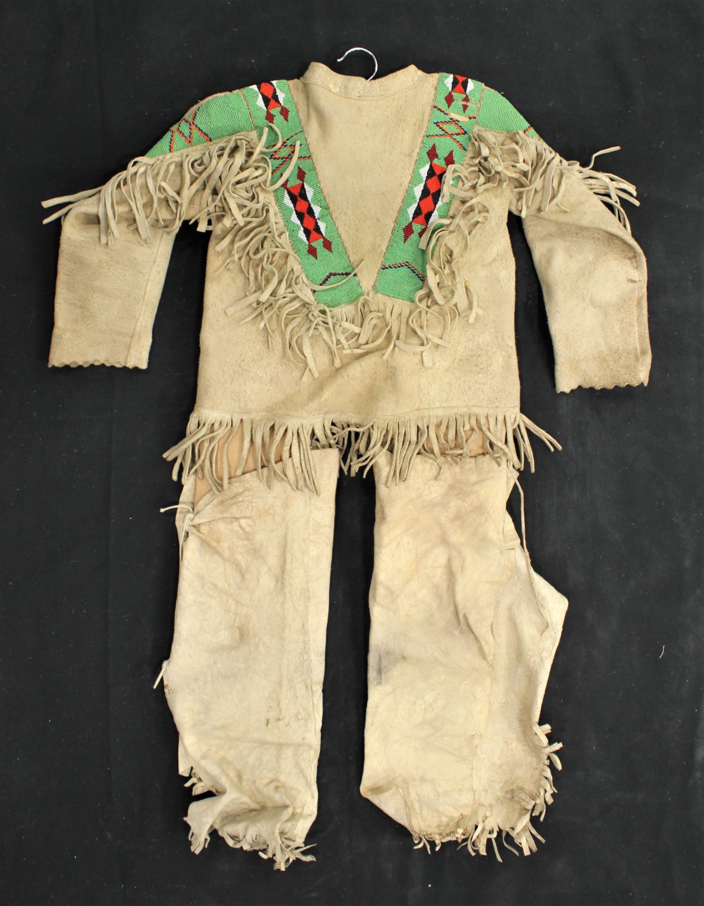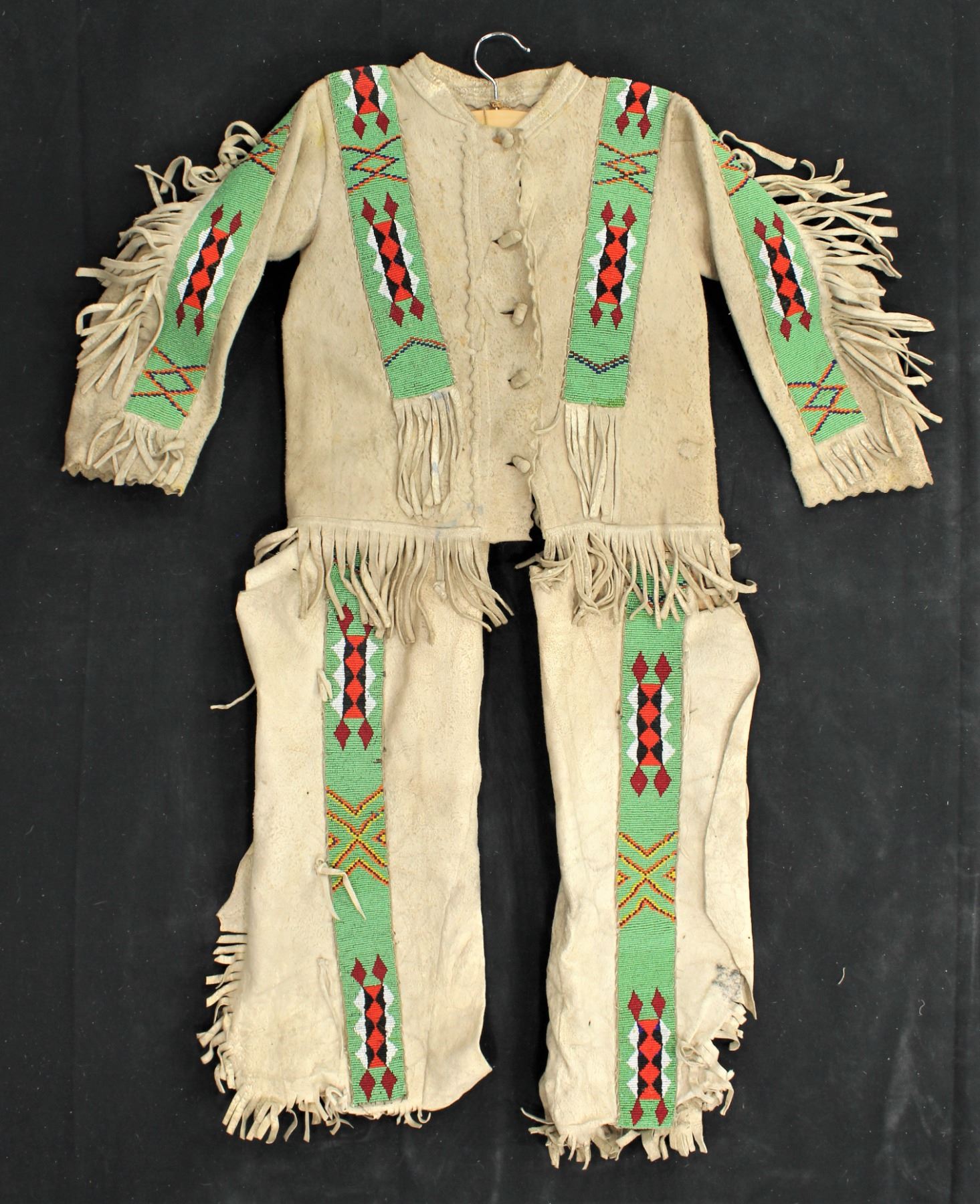 Impressive turn-of-the-Century buckskin shirt and pants with extensive beaded strips and fringe, done with geometric patterns on a green background. Fitting approximately a 10 year old.