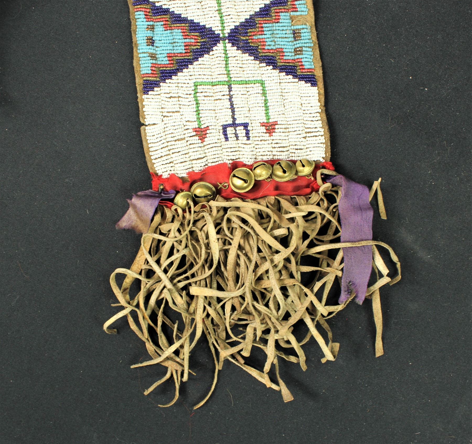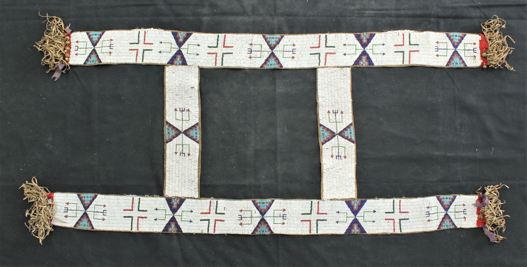 A wonderful 1890's Plains Indian beaded saddle blanket with appealing geometric design of cobalt blue and white heart beads on a white background, accented by thick fringe, decorative ribbons and hawk bells at each corner. In very good condition, having been disassembled, and currently in individual strips without the center canvas piece. Measuring 26"x 60".