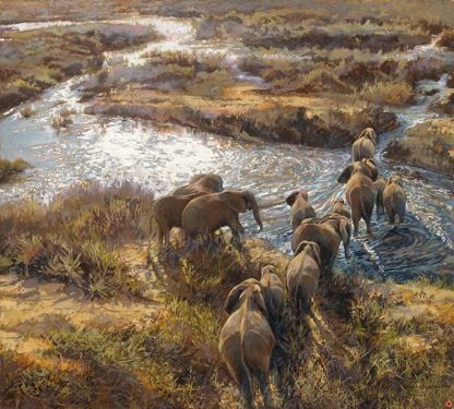 ÒLove, Life, and CommunityÓ aerial view of elephant herd crossing river in Kruger National Park, South Africa; in acrylic