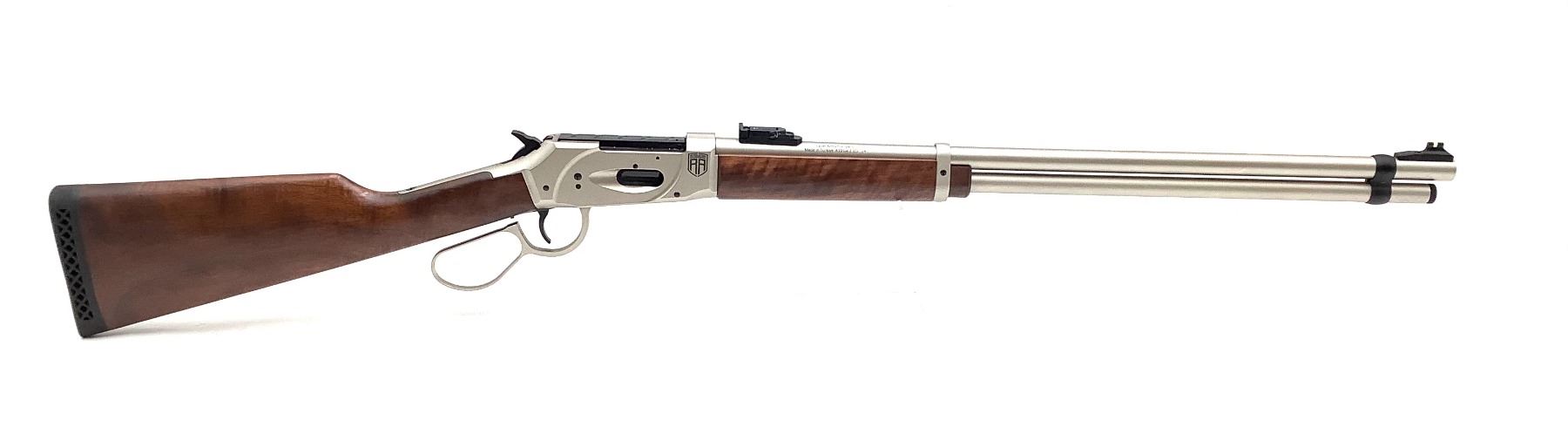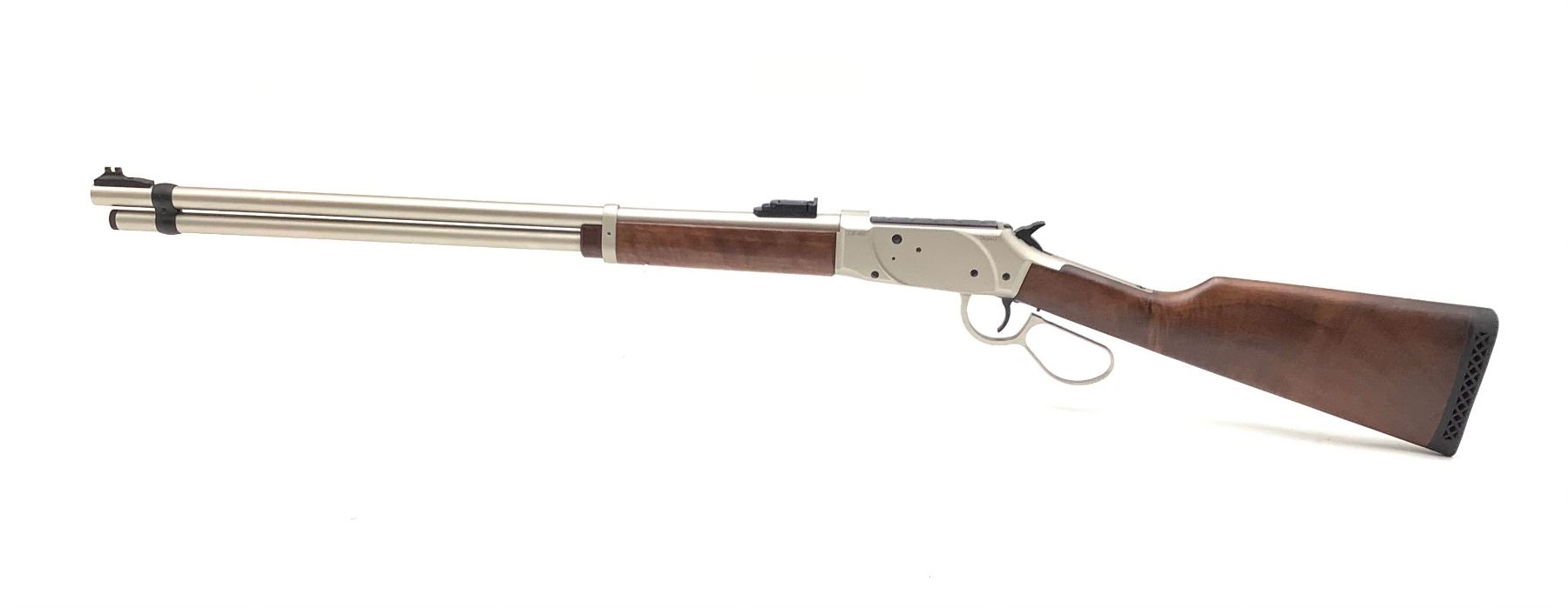 Revolution Armory Lever Action 410 Shotgun Nickel 24" Barrel And Receiver, New. Adjustable rear sight, fiber optic front. Comes with removable choke and plastic hard case. This is a non-restricted firearm.
